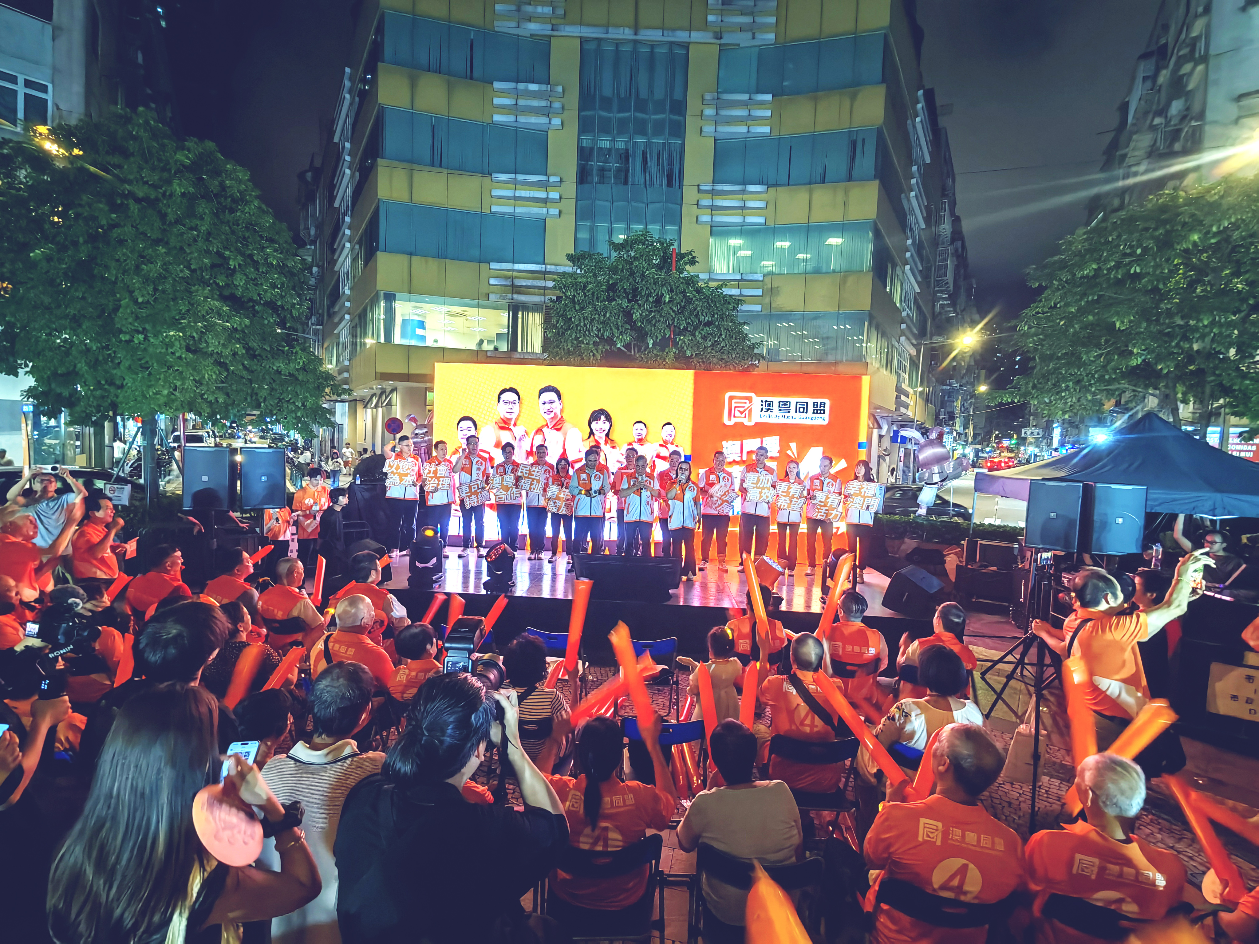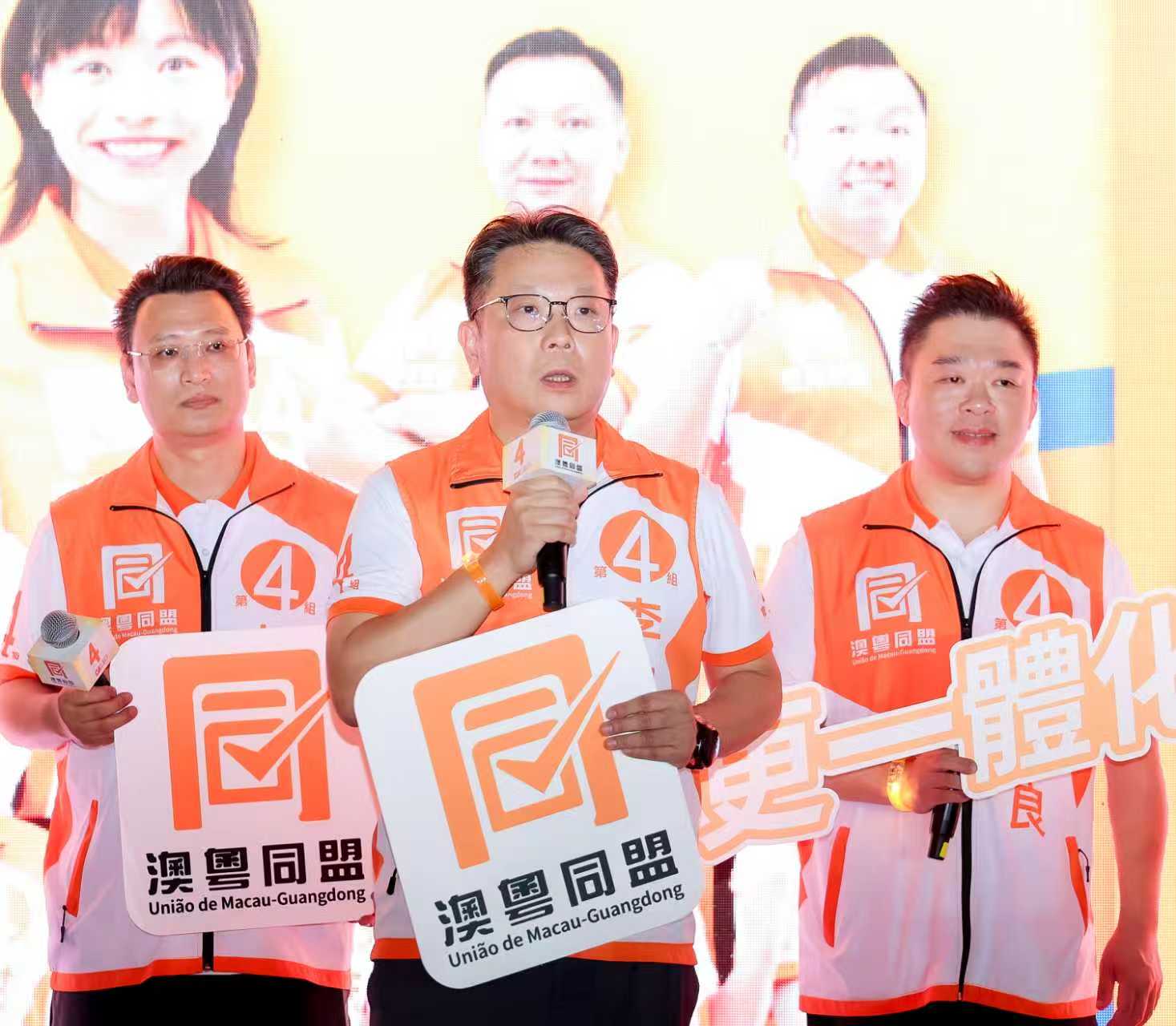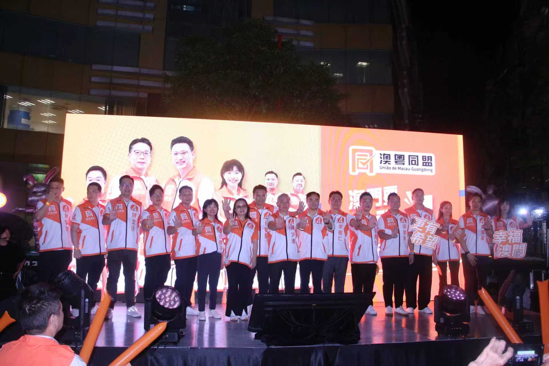 【即時新聞】第4組「澳粵同盟」晚上假三盞燈休憩區舉行首場造勢晚會,「澳粵同盟」十四位候選人上台闡述政綱及理念,爭取選民支持。他們圍繞「澳門要更幸福」參選理念,對經濟發展、民生福祉、澳粵合作、社會治理和青年發展五大領域政綱的生動闡述,希望攜手社會各界,共同謀劃澳門更好的未來,為廣大市民辦實事。