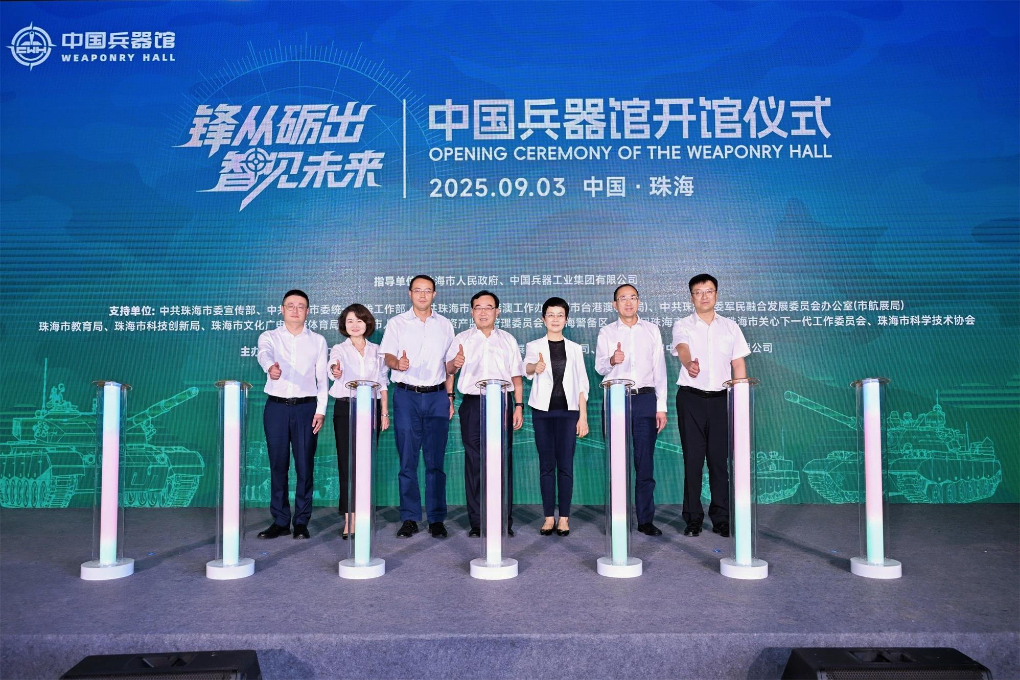 儀式上,珠海市關心下一代工作委員會主任陳英,珠海市政府副秘書長王玲萍,北方國際展覽有限公司總經理楊光輝,珠海市委統戰部副部長鄒煥忠,珠海市委軍民融合辦副主任、市航展局局長蘇全麗,珠海市國資委副主任孫潔峰,珠海格力集團董事長鄒暉共同按下啟動柱,宣佈中國兵器館開館。