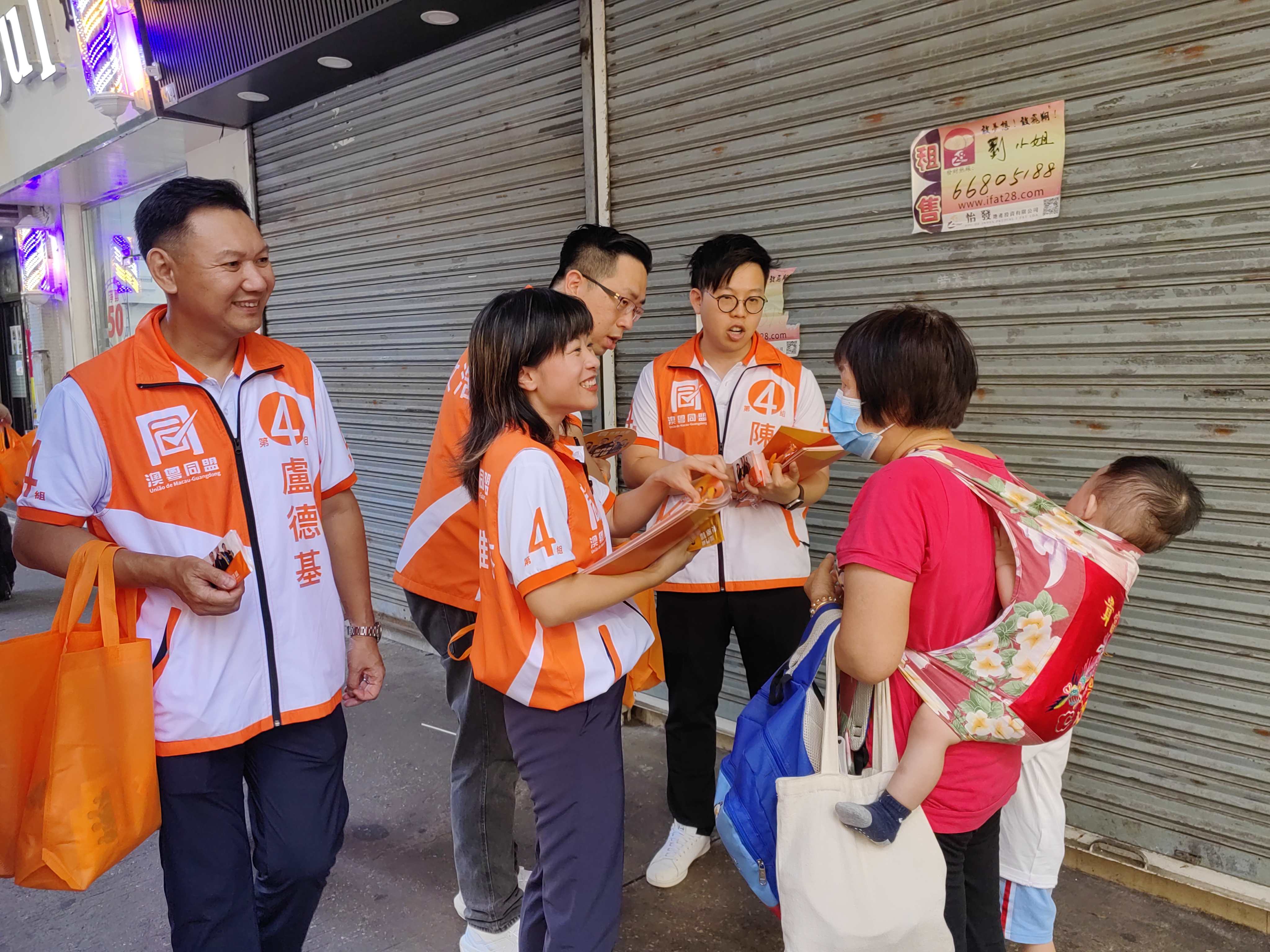 【即時新聞】為期兩周的第八屆立法會選舉競選活動正如火如荼展開中,第四組澳粵同盟候選人柳智毅、伍雅芬、盧德基、陳嘉豪、李耀坤、陳文浩、任君賢、黃家豪、林華傑、凌家珍等一行多人,今日分組走訪下環區、黑沙環區以及新馬路和十月初五街一帶,派發競選宣傳單張,介紹該組別候選人和參選政綱,並聽取居民意見,爭取選民支持。