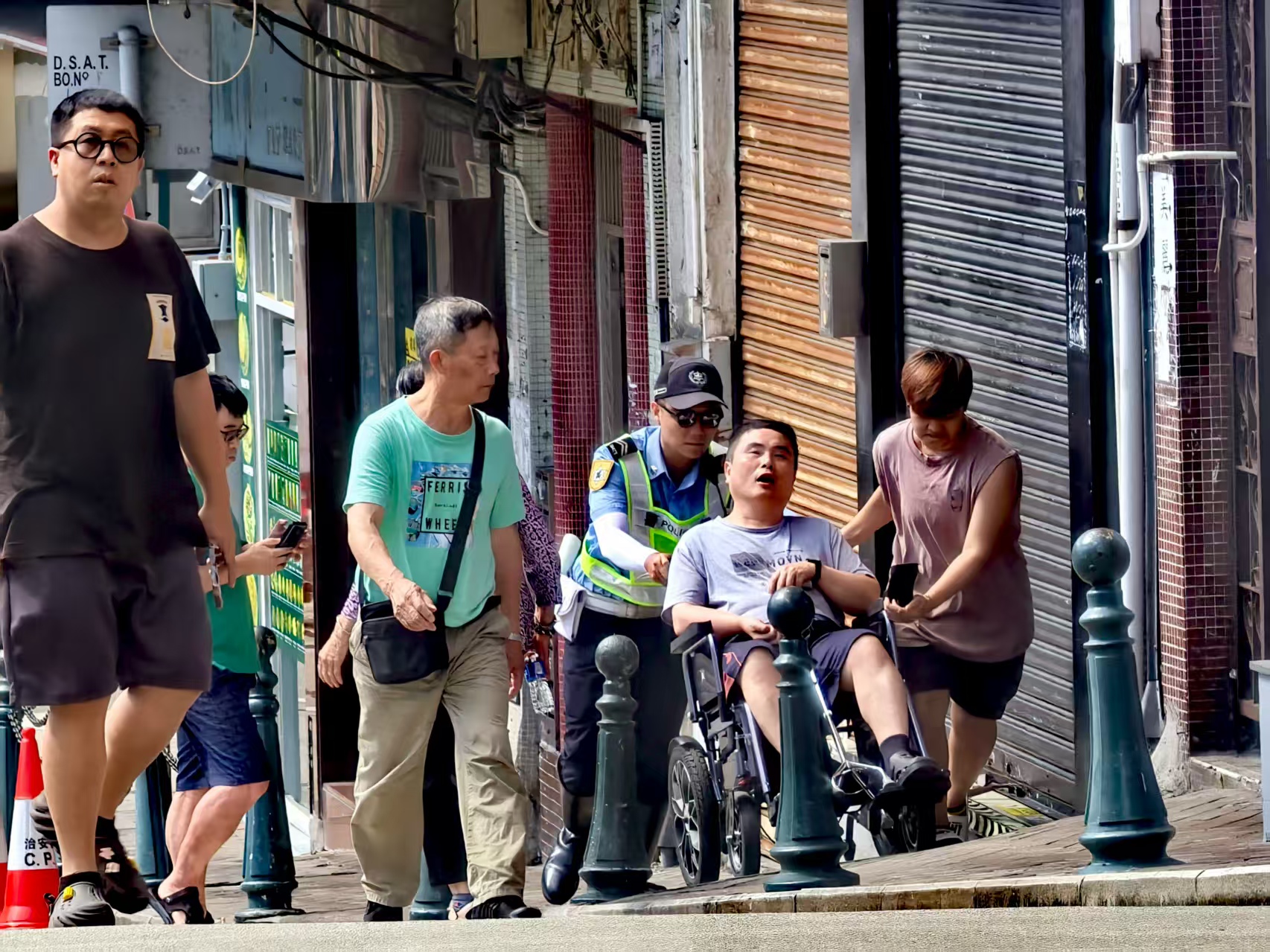 在東南學校附近,由於有斜坡關係,有警員協助坐輪椅的傷健人士前往票站投票。