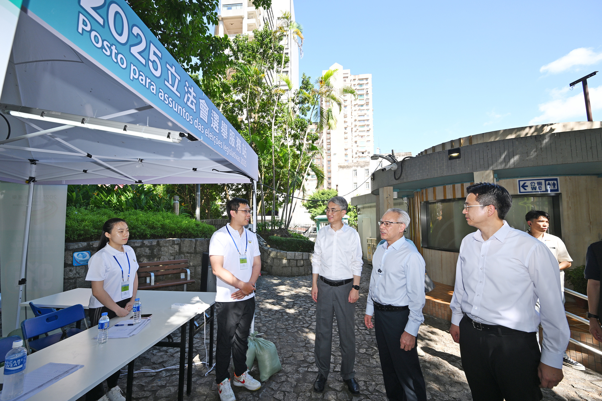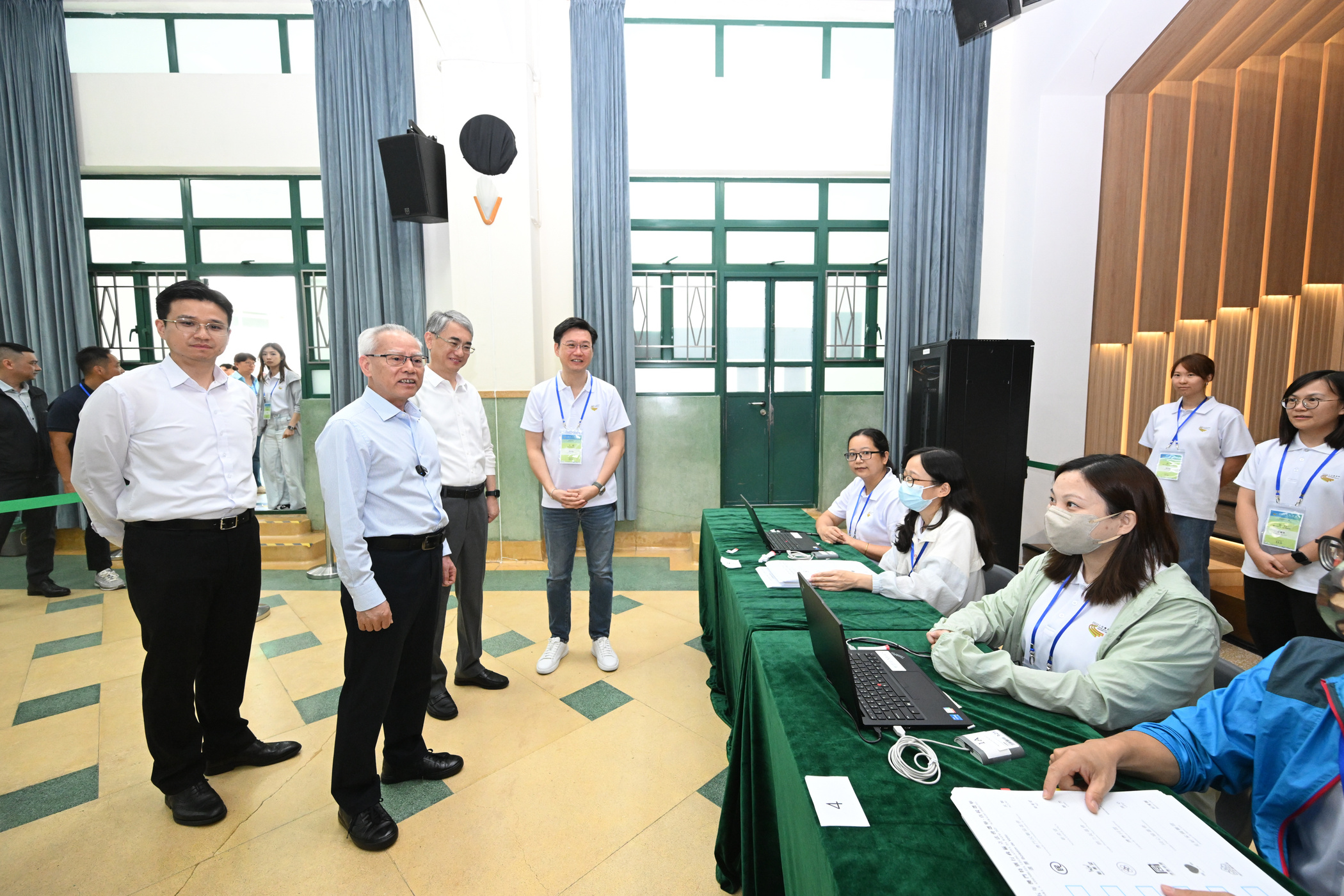 行政長官岑浩輝下午3時首先到鮑思高粵華小學投票站視察,隨後步行至鮑思高粵華小學投票站附近的螺絲山公園選舉服務站,關心工作人員的工作及輪休情況。