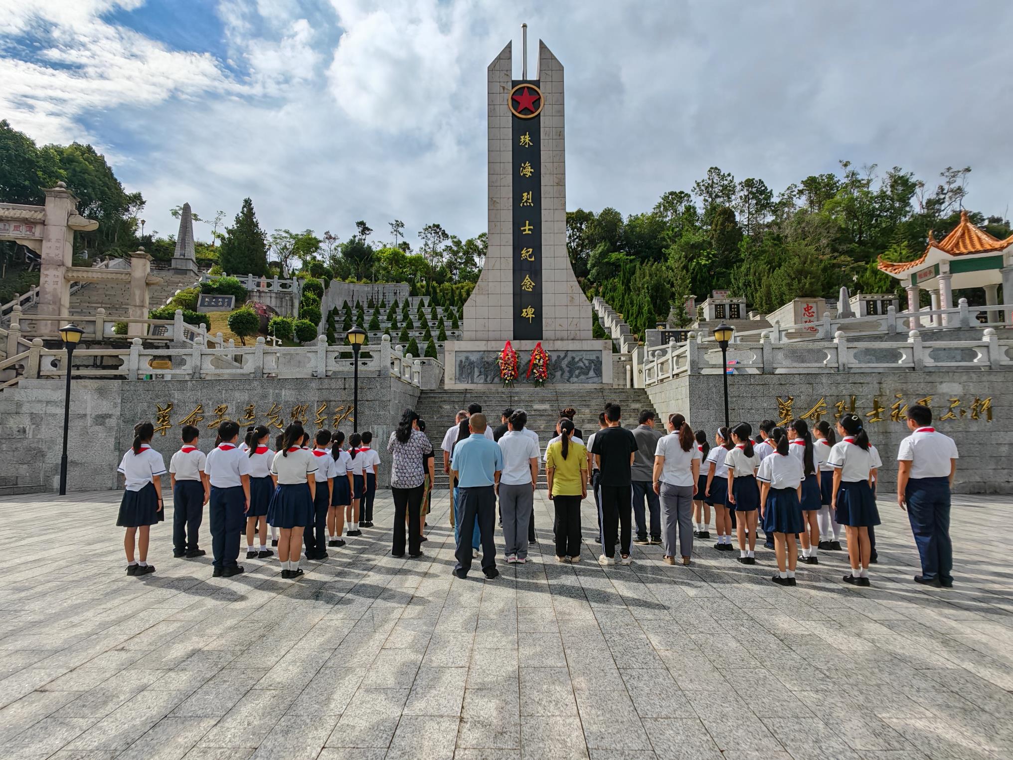 上午9時,獻花儀式在鳳凰山烈士陵園隆重舉行。全體人員整齊列隊,面向革命烈士紀念碑肅立。儀式在莊嚴的國歌聲中開始,隨後全場默哀三分鐘,表達對革命先烈的深切哀思。香洲區壯志學校學生代表發言,深情回顧抗戰歷史,表達新時代青少年繼承先烈遺志、奮發圖強的決心。香洲區委常委、宣傳部部長李志剛、民建珠海市委會委員周曉蕾等代表活動組織單位敬獻花籃,全體人員向革命先烈三鞠躬,並依次獻上鮮花,儀式莊重而感人。