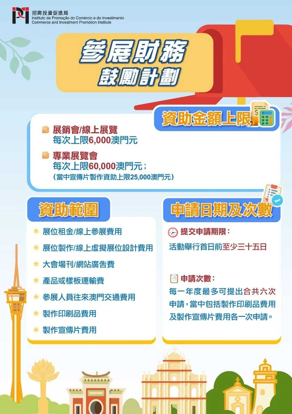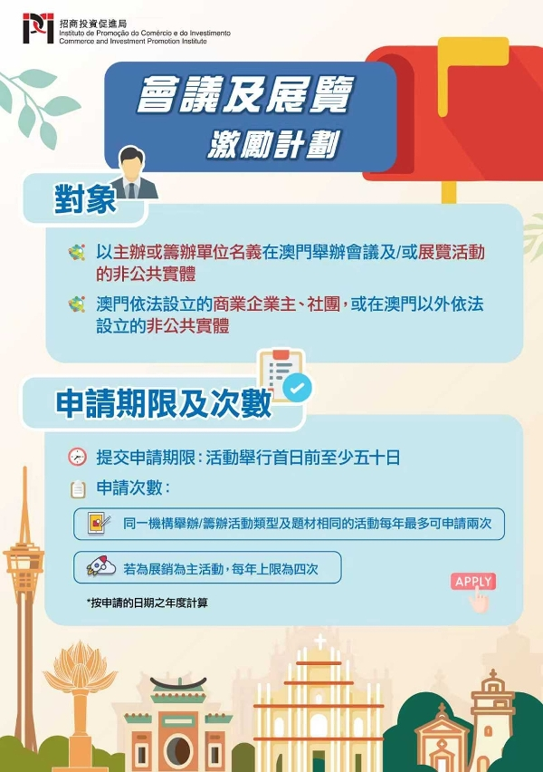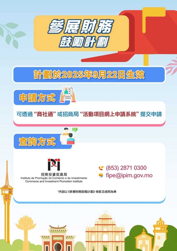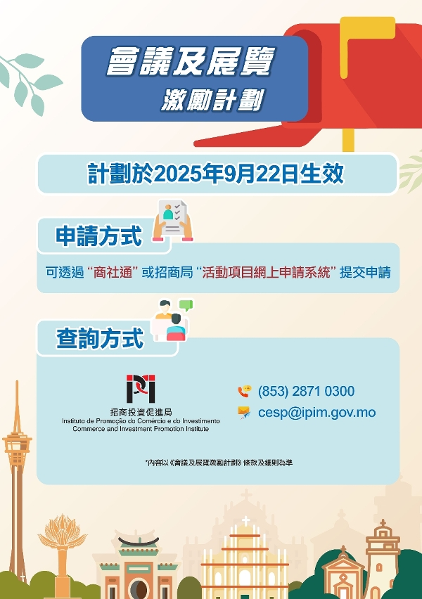當中,《會議及展覽激勵計劃》更加聚焦吸引具國際影響力、符合“1+4”產業方向的會展活動及鼓勵“一會展兩地"形式舉行,推動重點產業發展,加速與橫琴粵澳深度合作區的融合,促進“會展+旅遊”及“會展+招商”的跨界聯動。《參展財務鼓勵計劃》則將“參展”與“宣傳”兩類合併,每年最多可申請六次,並進一步明確各項審批要件,優化及簡便申請程序。兩項計劃均可透過“商社通"平台全程電子化申請。