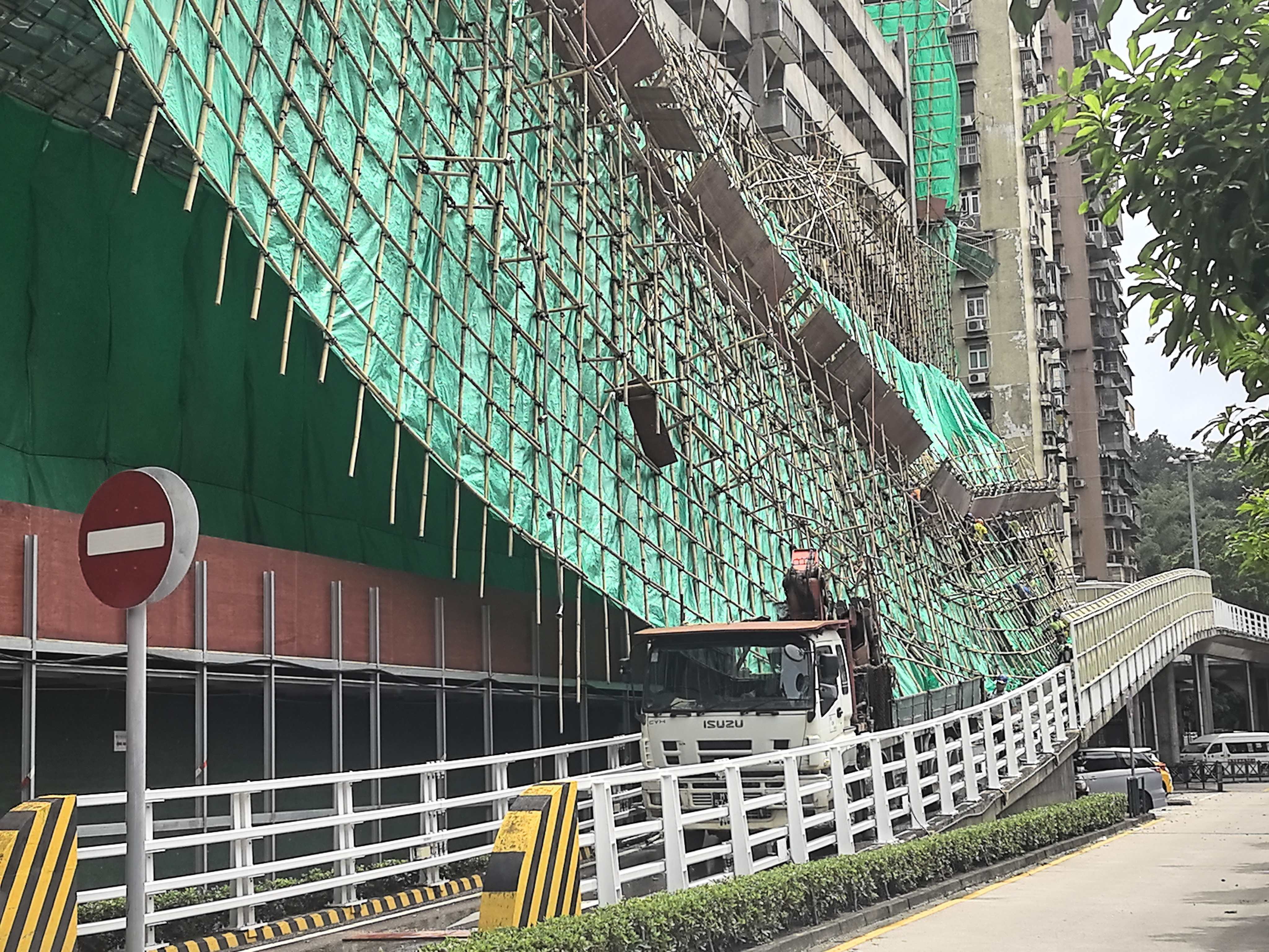 另外,台山嘉翠麗大廈外牆的竹棚在大風中被吹到摇摇欲墜。部分更跌在下面的行車天橋,工人正在搶修中。