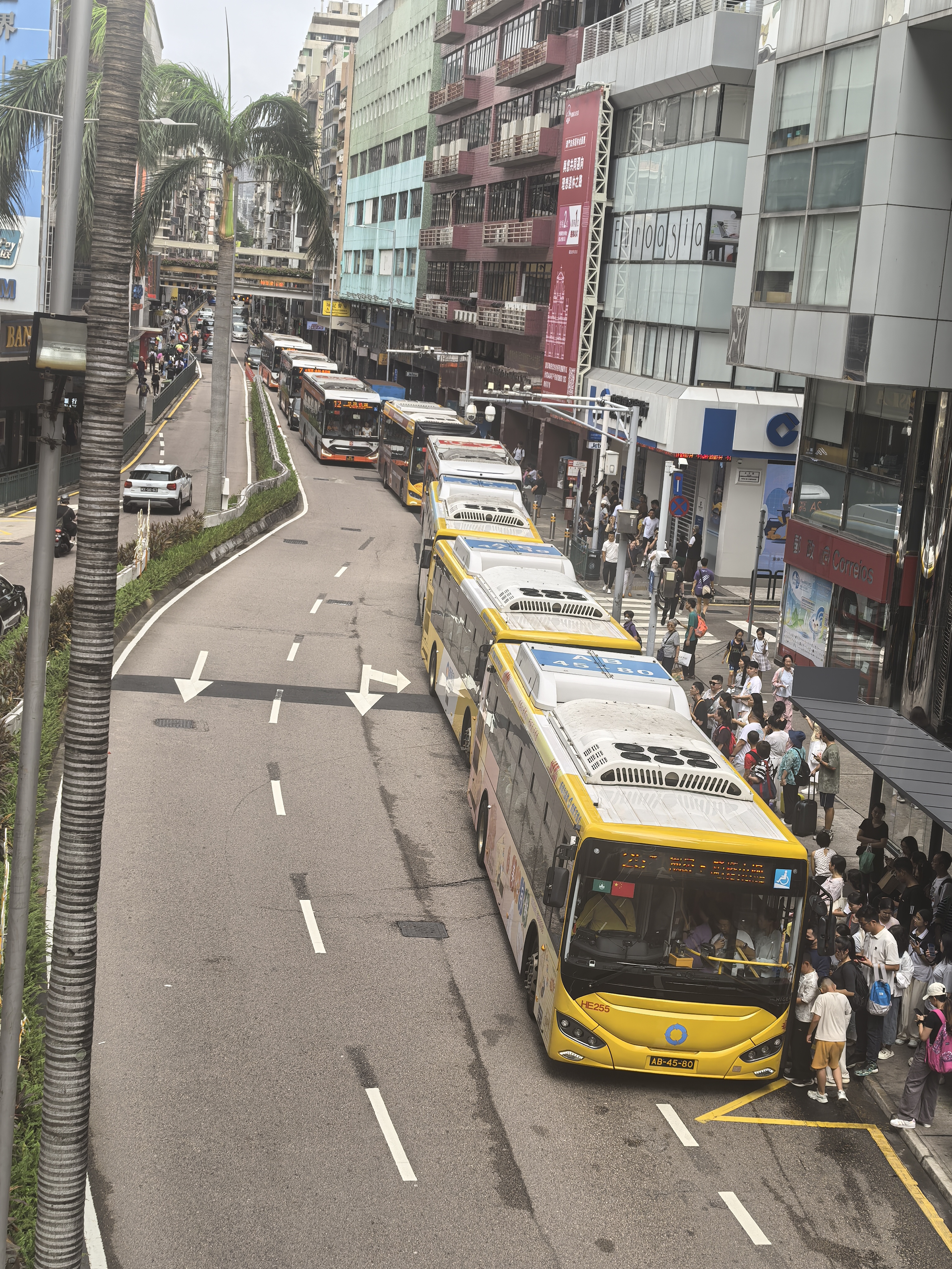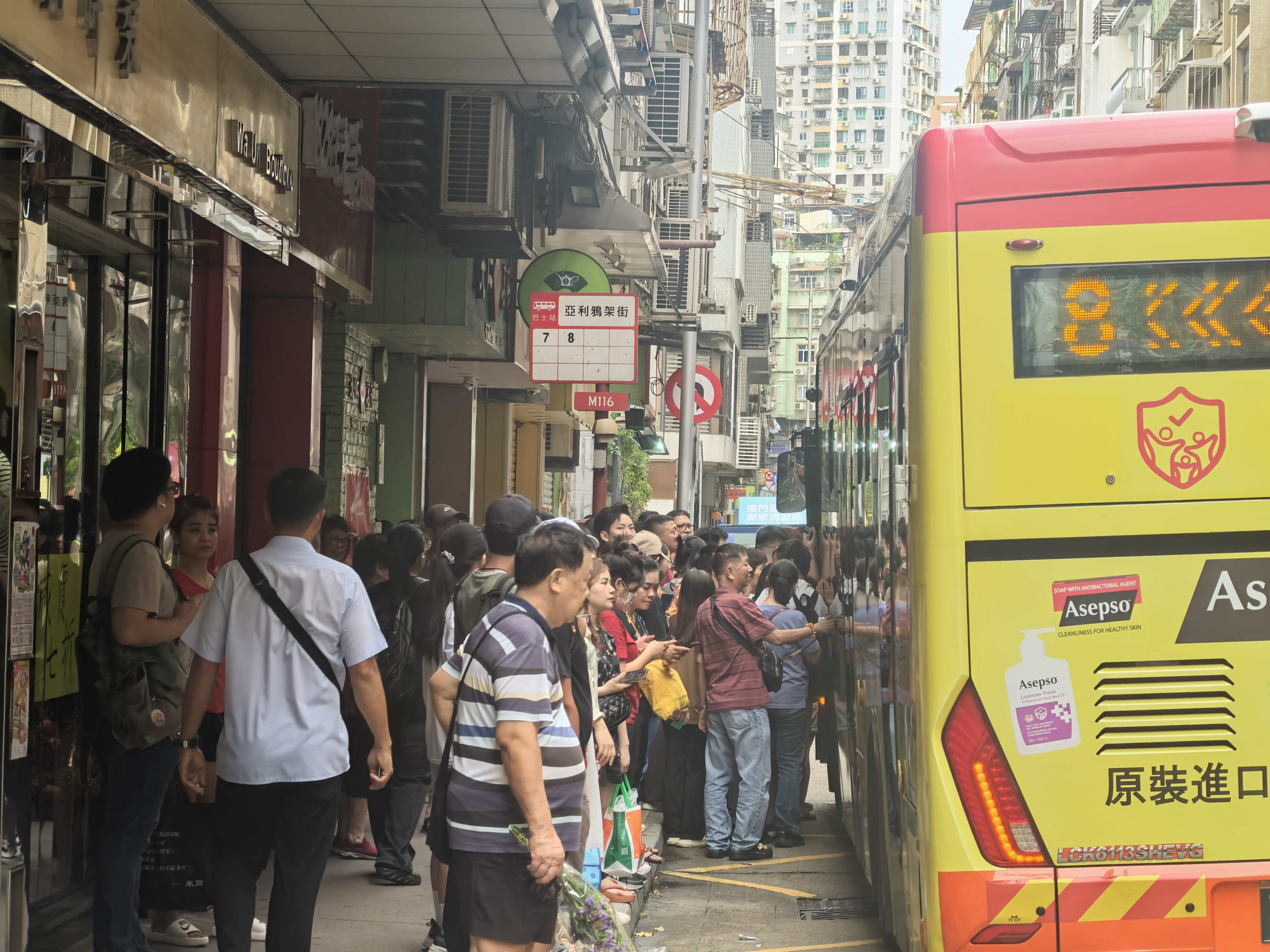 本澳市面下午開始交通大致回復正常,不少市民及遊客在巴士站等候乘搭巴士,青茂口岸附近亦有大批人士排隊輪流乘搭車輛上班。