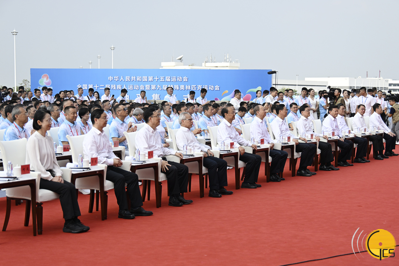 儀式上,火種護衛隊將“源火”盒安放至“源火”台,採火少女在“源火”台引燃手中的採火棒,中共中央政治局委員、廣東省委書記黃坤明,十五運會和殘特奧會組委會主任、國家體育總局局長高志丹,殘特奧會組委會執行主任、中國殘聯理事長周長奎,十五運會和殘特奧會組委會執行主任、香港特別行政區行政長官李家超,十五運會和殘特奧會組委會執行主任、澳門特別行政區行政長官岑浩輝,十五運會和殘特奧會組委會執行主任、廣東省委副書記、省政府黨組書記、深圳市委書記孟凡利共同上台高舉採火棒,點燃十五運會和殘特奧會火種盤,寓意粵港澳三地攜手共進、同心築夢。