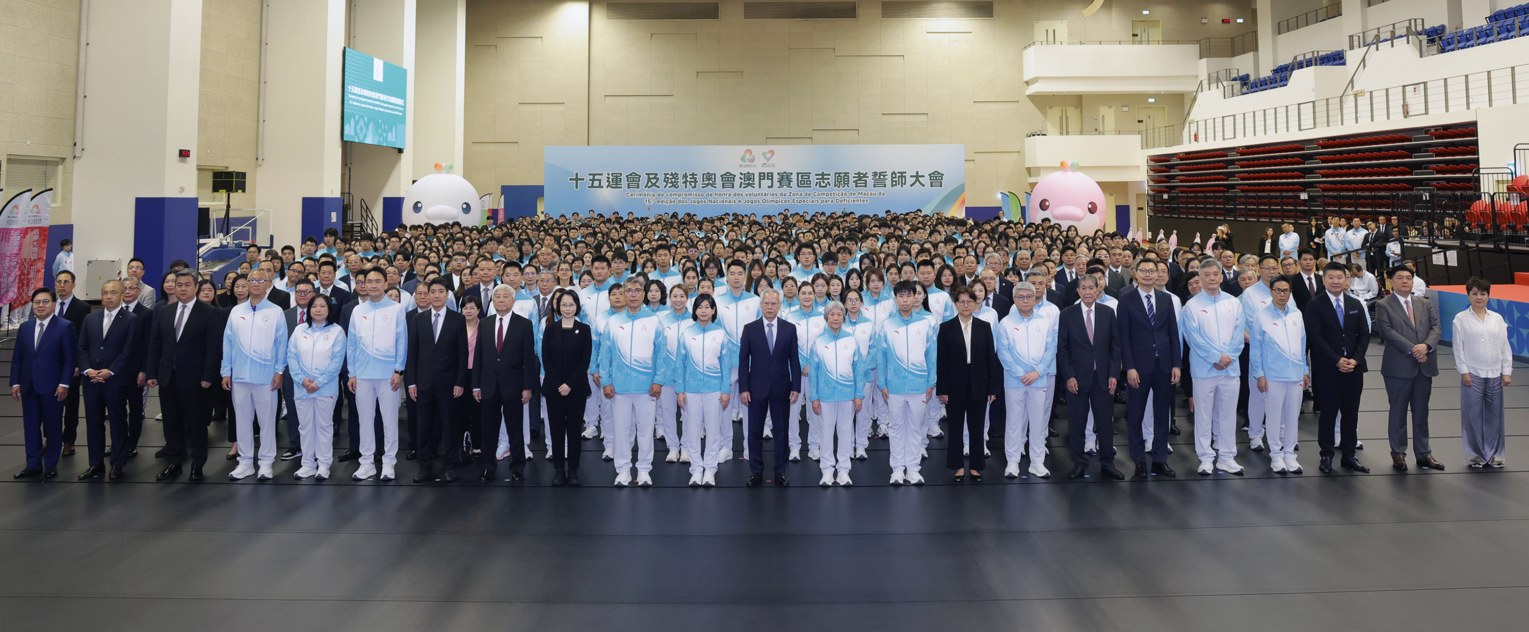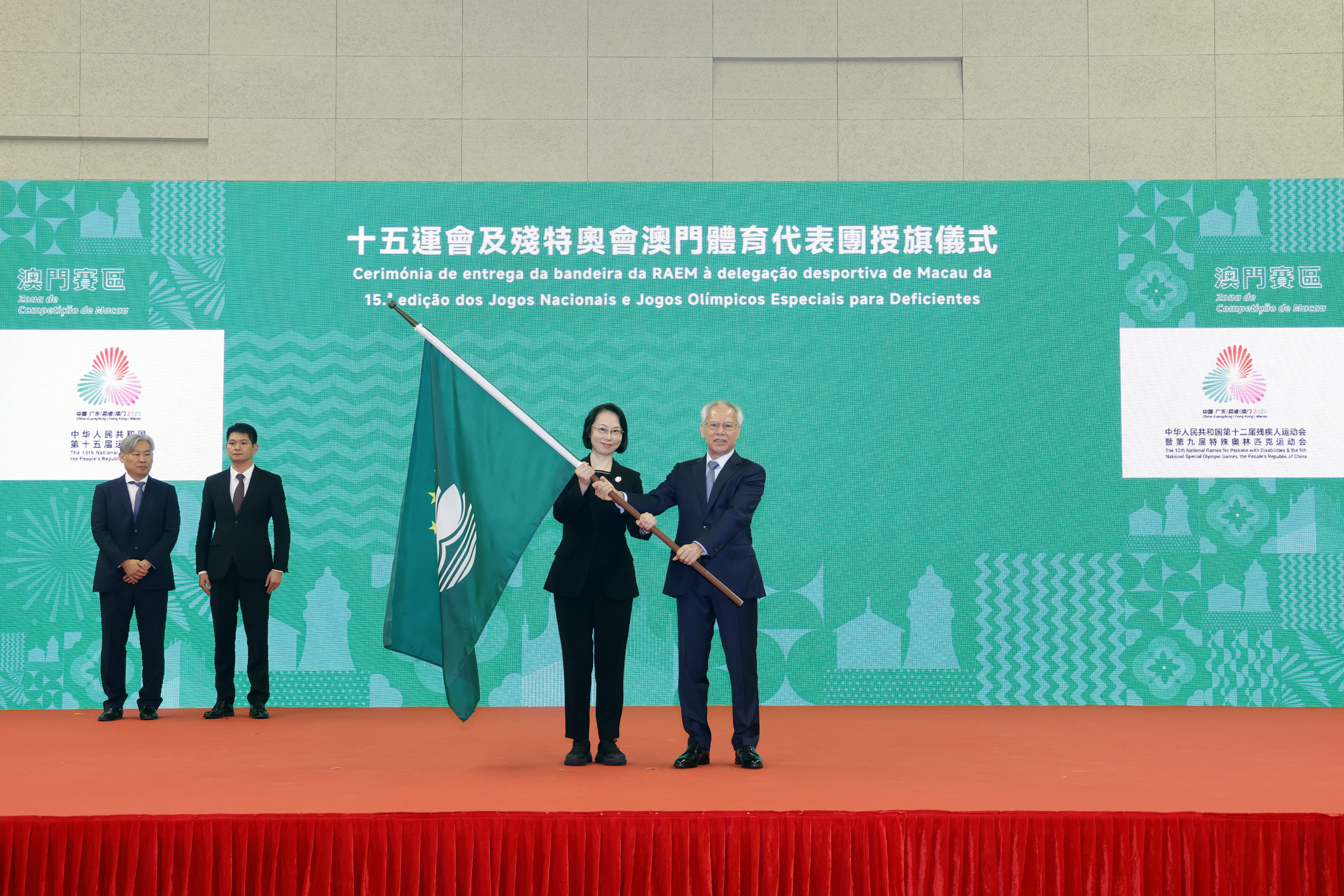 授旗儀式暨誓師大會在望廈體育中心舉行。岑浩輝向參與十五運會及殘特奧會的澳門體育代表團授旗,以及為澳門賽區志願者監誓。