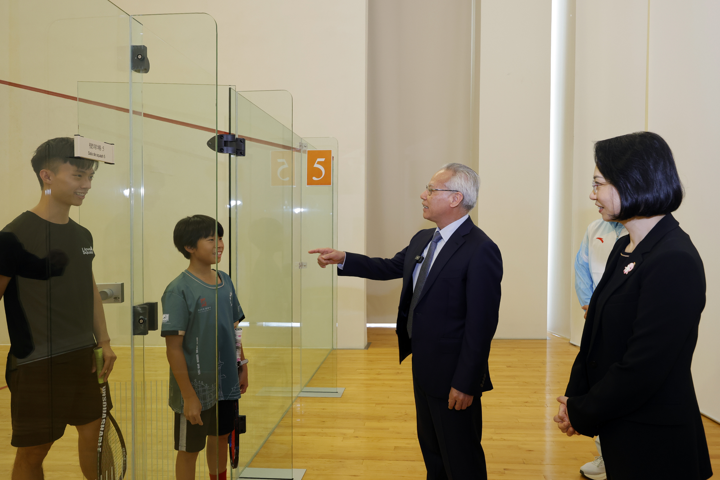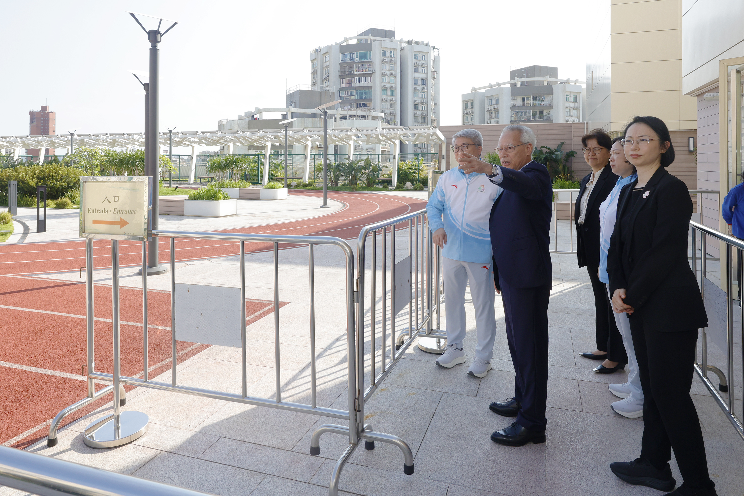 授旗儀式暨誓師大會結束後,岑浩輝在社會文化司司長柯嵐陪同下,視察望廈體育中心的多項運動設施,了解相關設施日常的使用情況,並與市民親切交流。