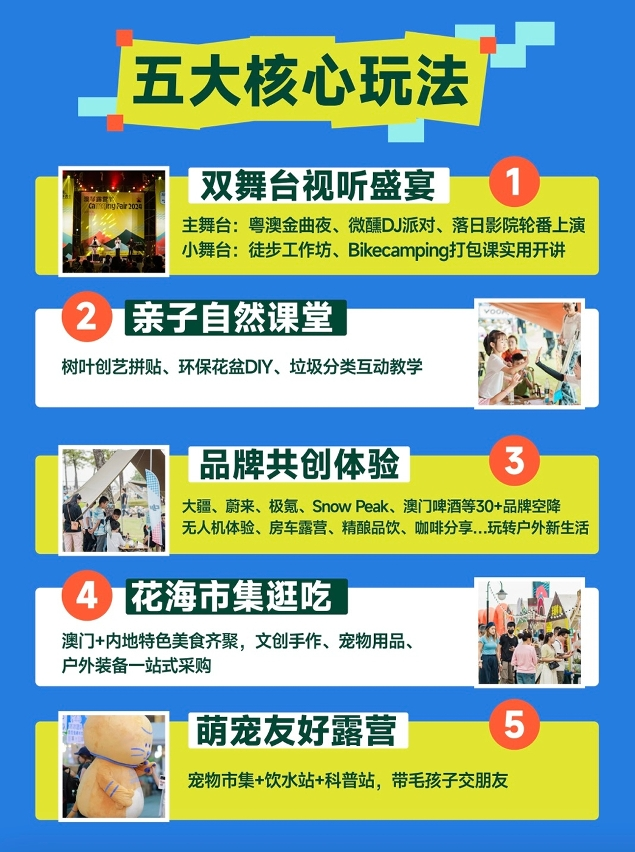 今年,露營節還聯合橫琴創新方、橫琴口岸·琴鳴廣場、橫琴華發商都推出豐富活動與專屬福利,打造“城市露營福利站”及多個主題打卡點,於10月9日至10月31日發放商戶優惠券,實現“先享商圈優惠,再赴自然露營”的趣遊體驗。同時,澳門利斯大廈(議事亭前地廣場)作為預熱分會場,設有戶外裝備體驗區,參與者可拍照打卡並參與橫琴主會場抽獎,贏取驚喜好禮。
