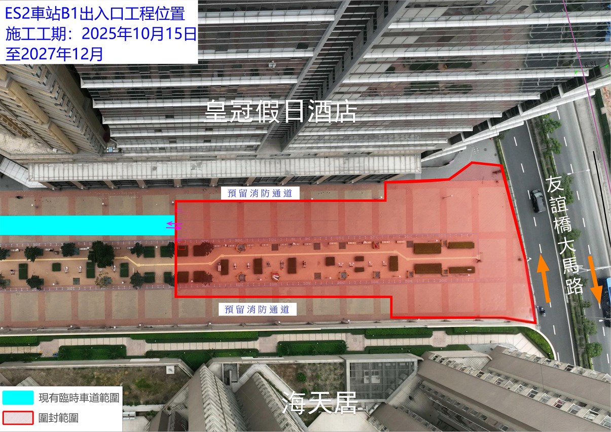 【即時新聞】公共建設局現正有序推進輕軌東線ES1及ES2站三個出入口施工進程。配合ES2站B出入口施工,東方明珠休憩區需擴大現有圍封範圍,但會預留消防車通道(詳見附圖),有關臨時措施將於2025年10月15日起至2027年12月結束。公共建設局表示將定期檢視有關措施的實施情況,做好施工管理及協調工作,爭取盡早完成工程,減少對市民及周邊環境的影響;因工程帶來的不便,敬請市民諒解。