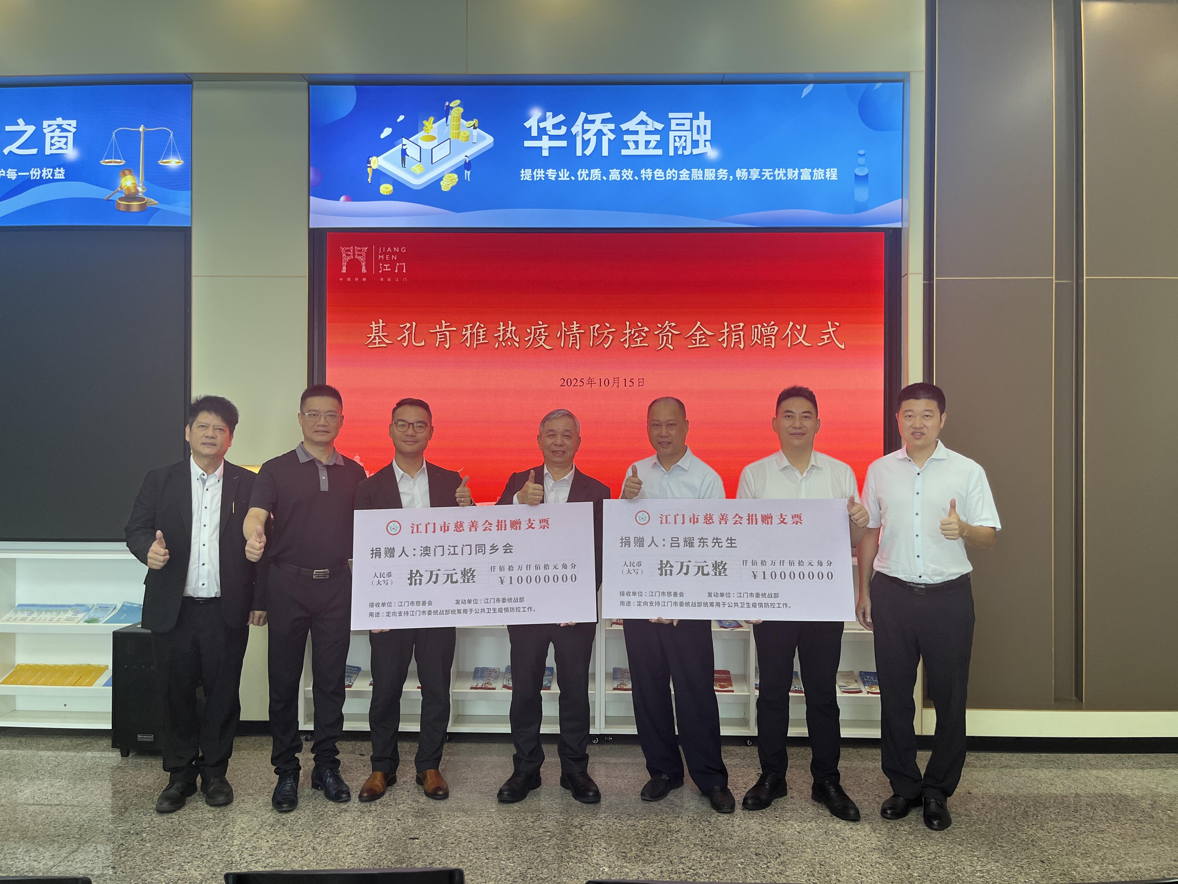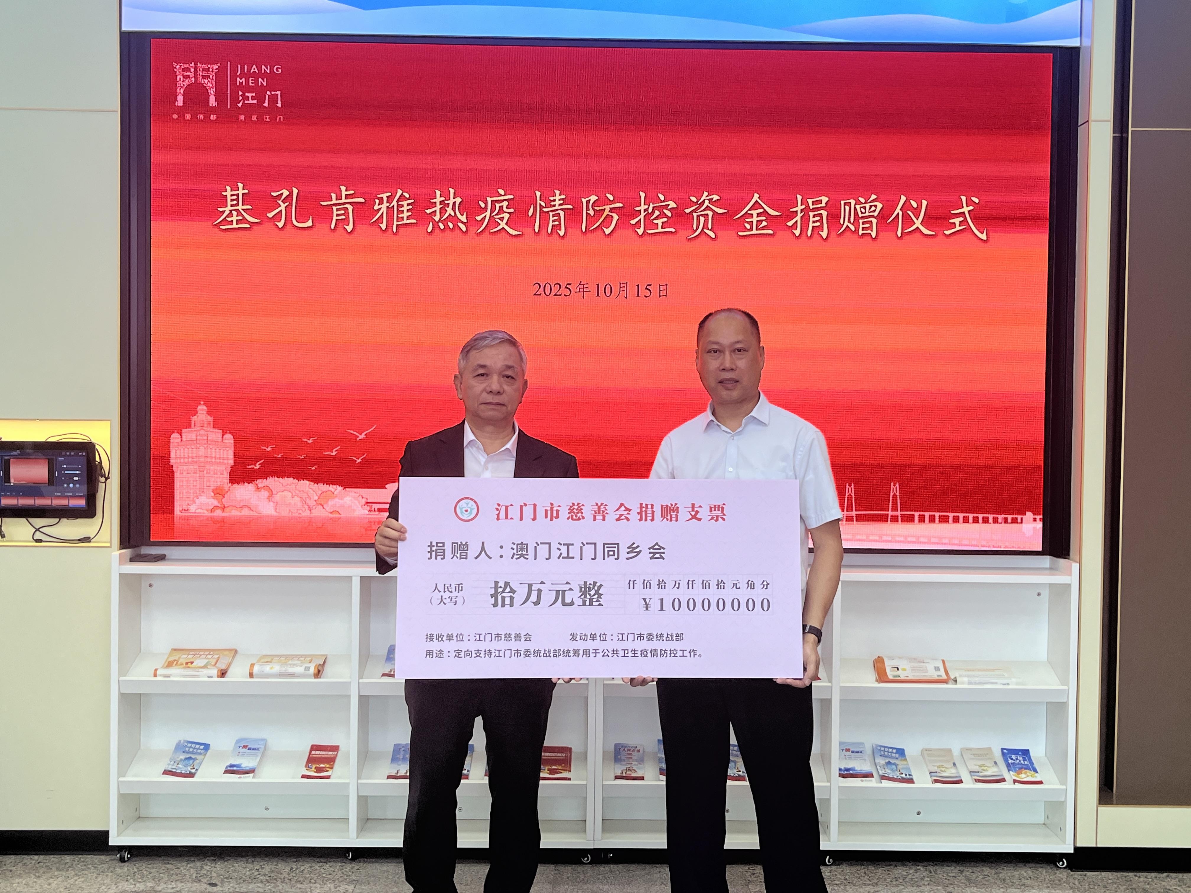 【即時新聞】江門市日前發生基孔肯雅熱疫情,防控工作正處攻堅階段。10月15日下午,江門市委統戰部在江門華僑華人服務中心舉行“基孔肯雅熱疫情防控資金捐贈儀式”。澳門江門同鄉會、港澳鄉親呂耀東分別向江門市委統戰部捐贈人民幣10萬元,全力支援江門抗疫工作。