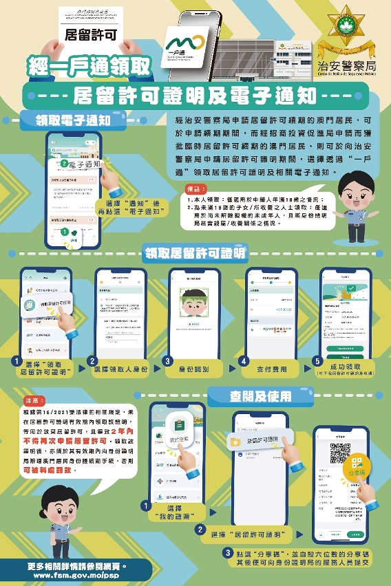 經治安警察局申請居留許可續期的澳門居民,可於申請續期期間,而經招商投資促進局申請而獲批臨時居留許可續期的澳門居民,則可於向治安警察局申請居留許可證明期間,選擇透過“一戶通”領取居留許可證明及相關電子通知。待上述申請獲得批准後,便可以透過“一戶通”領取有關證明及相關通知。倘屬經治安警察局申請續期之個案,該電子通知內容尚包括申請人獲批准居留許可續期的通知。