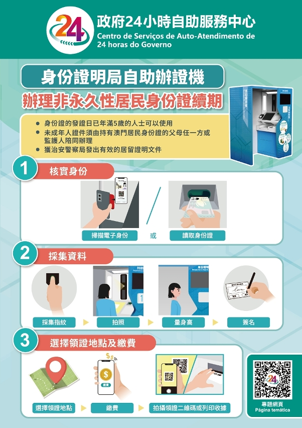 若於澳門特別行政區非永久性居民身份證的本次發證日已年滿5歲,在經“一戶通”領取的居留許可證明之有效期內,可前往任何政府24小時自助服務中心自助辦理居民身份證續期手續。另須留意,未滿18歲的申請人須在父、母或監護人陪同下辦理。辦證時,申請人可選擇使用現場拍攝的照片或提交“一戶通”內“我的照片”的“證件照”作為身份證相片,再按系統指示操作便完成申請手續。