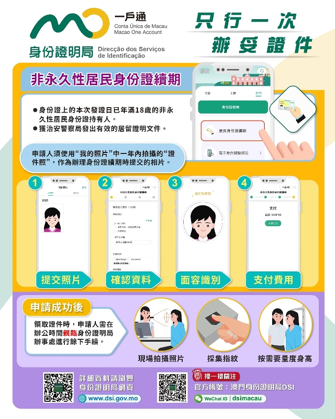 若於澳門特別行政區非永久性居民身份證的本次發證日已年滿18歲,在經“一戶通”領取的居留許可證明之有效期內,可於“一戶通”使用“居民身份證續期”服務。辦證時,申請人須使用“一戶通”內“我的照片”的“證件照”作為身份證相片,再按系統指示操作便完成申請手續。完成證件製作後,申請人只須於辦公時間親臨身份證明局領取證件時辦理餘下手續(包括現場拍攝照片、採集指模、量度身高)即可。