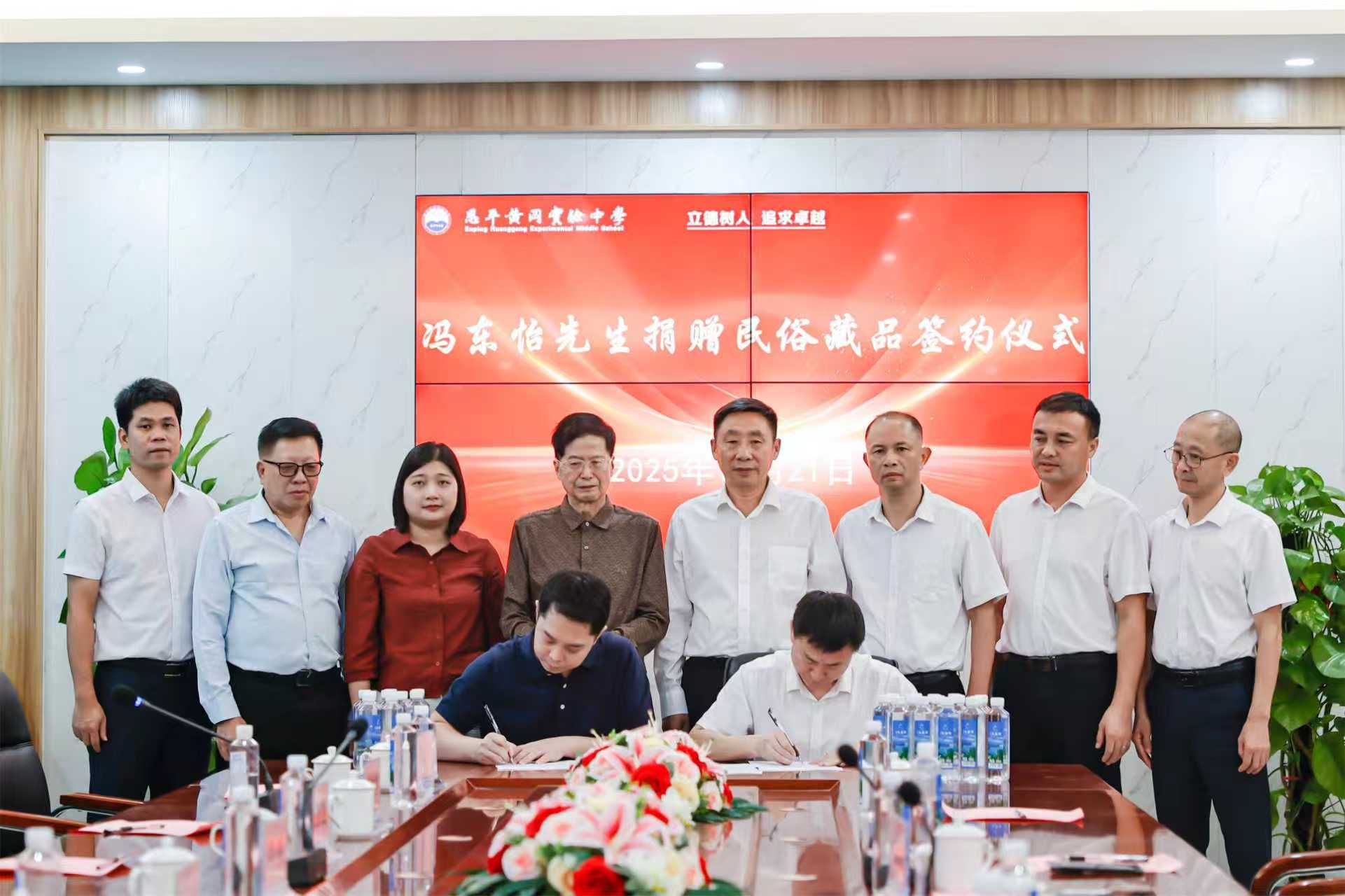 當日上午,捐贈簽約儀式在數十位各界代表的共同見證下隆重舉行。據悉,校方將在新建圖書館旁特設展區,使書卷墨香與古物風華相映成趣,讓閱讀與文化體驗實現有機融合。93歲的恩平縣老縣長馮炎和教育、僑聯,文化方面的幹部代表出席簽約儀式。