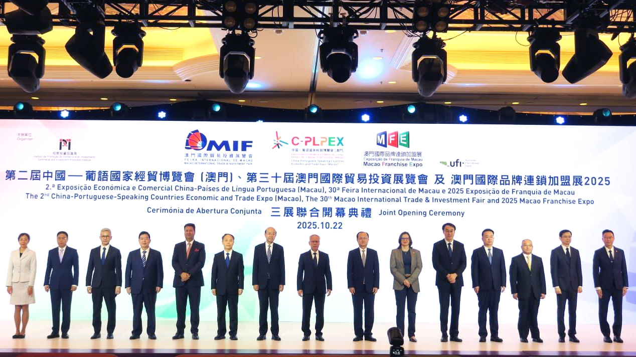 【即時新聞】第二屆中國-葡語國家經貿博覽會、 第三十屆澳門國際貿易投資展覽會及澳門國際品牌連鎖加盟展2025(2025MFE)三展聯合開幕典禮上午10時假澳門威尼斯人佛羅倫斯廳舉行。,行政長官岑浩輝,外交公署特派員劉顯法,中國商務部副部長鄢東,農業農村部副部長張治禮,江蘇省副省長趙岩,山東省副省長陳平,福建省副省長王金福,中聯辦經濟部部長劉德誠,廣州副市長胡浩,巴西聯邦政府漁業與水產養殖部水產養殖國務秘書Dra. Fernanda Gomes de Paula,葡萄牙共和國農業和海洋部農業國務秘書Eng. João Moura,經濟財政司司長戴建業等出席。