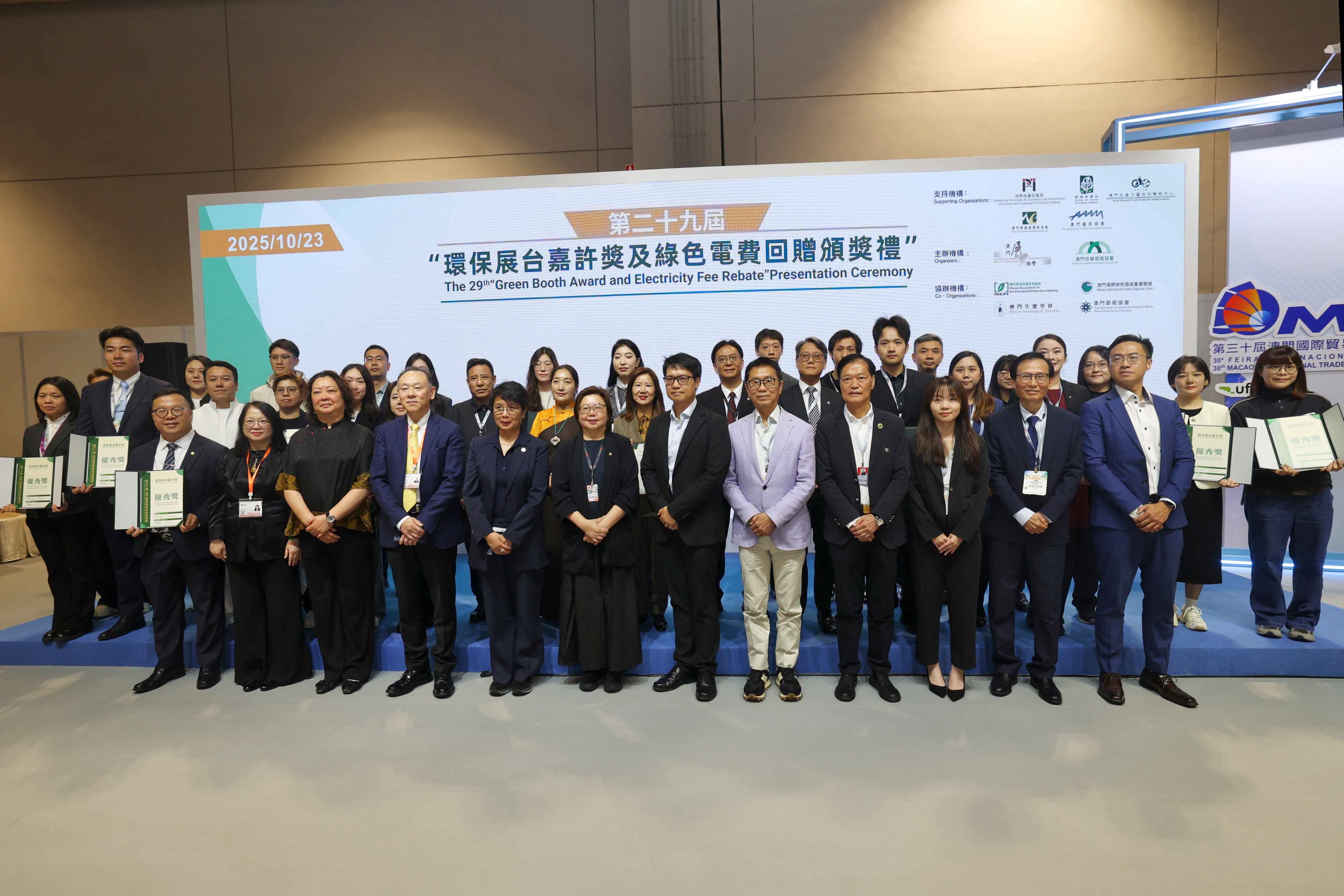 據悉,是次頒獎禮共40家特裝參展商及19家承建商參與,獎項評定聚焦於可持續實踐,核心標準包括推廣模塊化設計以提升搭建物重複使用率、審核材料的可循環再造比例、評估節能方案實現的省電比例、考量廣告印刷品與物流運輸等物料的環保管理,並鼓勵通過碳中和等舉措,最大化減少展台的全生命週期環境影響,以此表彰行業先鋒,共同邁向綠色會展新標準。會上,第三十屆澳門國際貿易投資展覽會(MIF)、第二屆中國-葡語國家經貿博覽會(澳門)及澳門連鎖品牌國際加盟展(MFE)獲發綠色會展及活動標籤認證,另有7家參展商獲頒發展台碳中和證書。