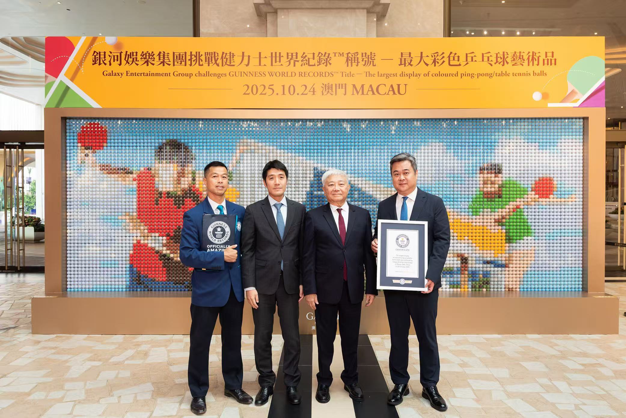 銀娛企業事務董事林志成代表集團領取健力士世界紀錄獎狀 ,並在證書頒授儀式上表示,這項破紀錄的最大彩色乒乓球藝術品,充份展現銀河對澳門體育事業,尤其是乒乓球運動發展的堅定支持,亦彰顯銀河綜藝館作為澳門眾多體育盛事據點的魅力。同時,這亦是銀娛及旗下物業第三度獲得健力士世界紀錄的殊榮,期望藉此進一步助力推廣澳門「世界旅遊休閒中心」定位的多元魅力。
