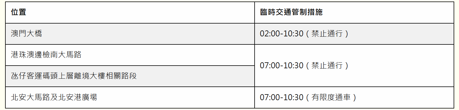 賽事舉辦當日,澳門往珠海、香港方向及珠海往香港、澳門方向封控時間為上午9時至12時半,因此,當日上午8時起,人員和車輛(包括物流及貨運)將停止進入港珠澳大橋澳門邊檢大樓及車道;而香港往珠海、澳門方向封控時間為上午7時半至12時半,大橋香港口岸旅檢大樓出境大堂及出境車輛通關廣場將在當日上午6時半關閉,跨境交通(金巴、機場中轉巴、港澳跨境巴士和出租車服務)將臨時暫停服務。澳門海關會提前發佈和宣傳港珠澳大橋口岸臨時封閉的訊息,讓市民、旅客、通關車輛及貨運業界能及早作出安排,或於相關時段使用其他口岸出入境。