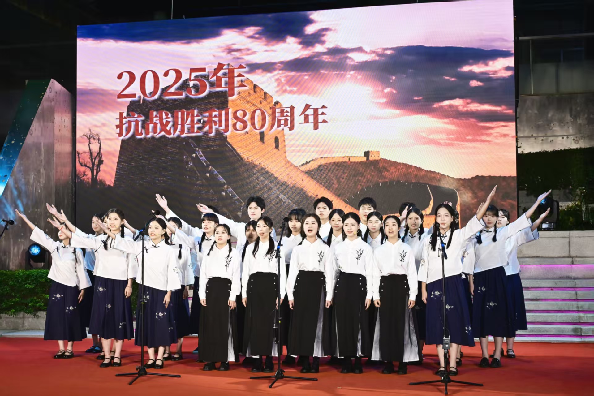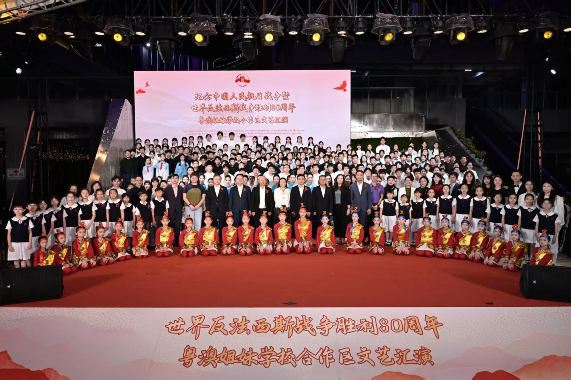 來自澳門及廣東省的12所姐妹學校齊聚一堂,包括高美士中葡中學及惠州市實驗中學,培正中學及東莞市松山湖實驗中學,培華中學、橫琴粵澳深度合作區首都師範大學子期實驗中學及汕尾市海豐縣彭湃中學,聖公會(澳門)蔡高中學及廣東肇慶中學,澳門坊眾學校、橫琴粵澳深度合作區第一中學及濠江中學的師生參與。演出節目豐富多彩,涵蓋民族管弦樂合奏、舞蹈、朗誦、合唱等多種形式,兩地學生以藝術為媒介,表達對抗戰英烈的深切緬懷以及對中華文化的創新詮釋,展現粵澳青年學生對民族歷史的深刻理解與時代擔當。