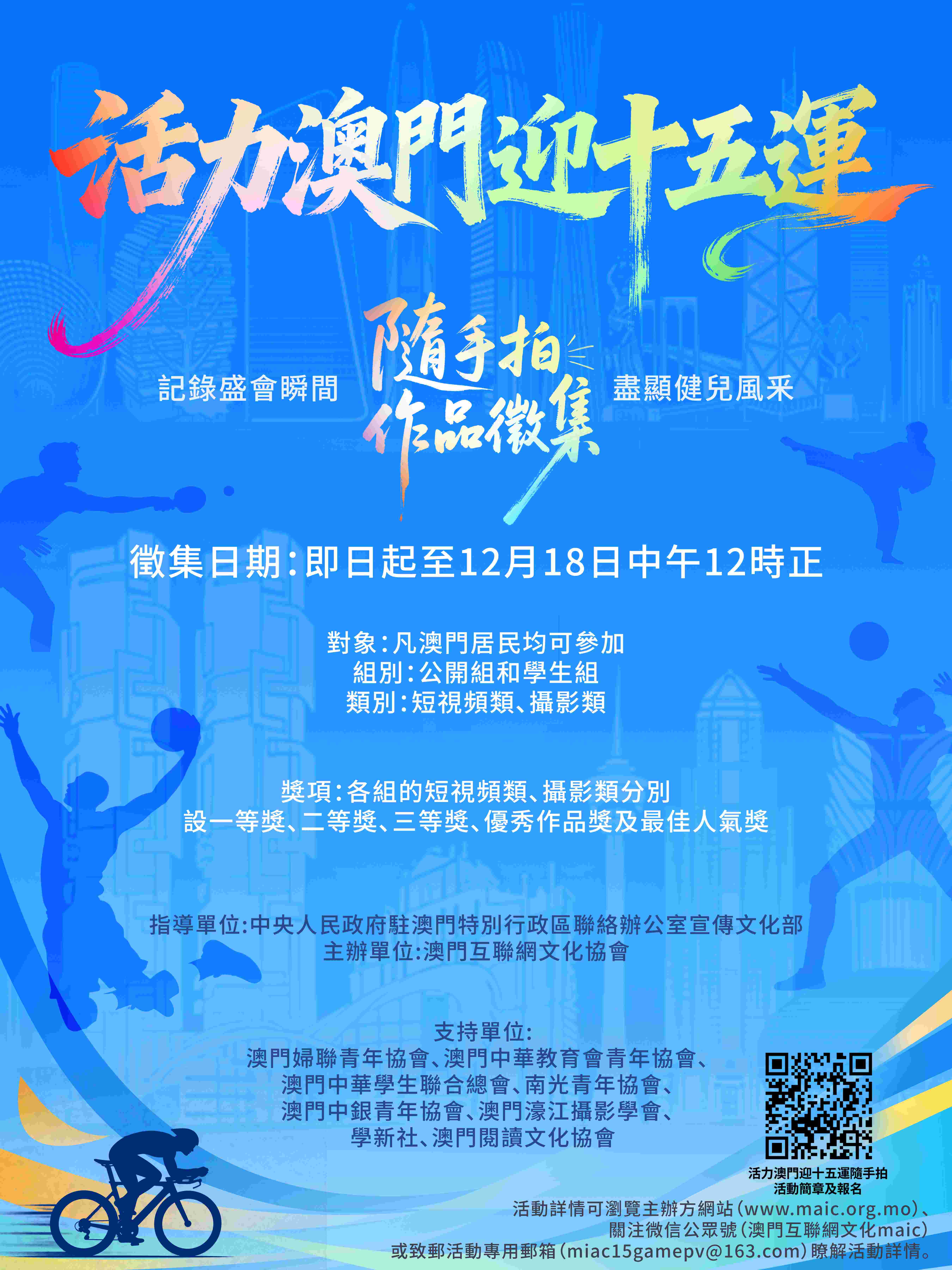 【即時新聞】為迎接第十五屆全國運動會及全國第十二屆殘疾人運動會暨第九屆特殊奧林匹克運動會(簡稱「十五運」),詮釋「激情全運會,活力大灣區」核心主題,助推澳門「體育之城」建設,由澳門互聯網文化協會主辦的「活力澳門迎十五運」隨手拍作品徵集活動今日正式啟動。活動即日起面向全澳市民開放報名,作品徵集期至 2025 年 12 月 18 日,誠邀市民以手機、相機或其他拍攝器材,用影像見證全運盛事,定格澳門體育熱情與城市活力。