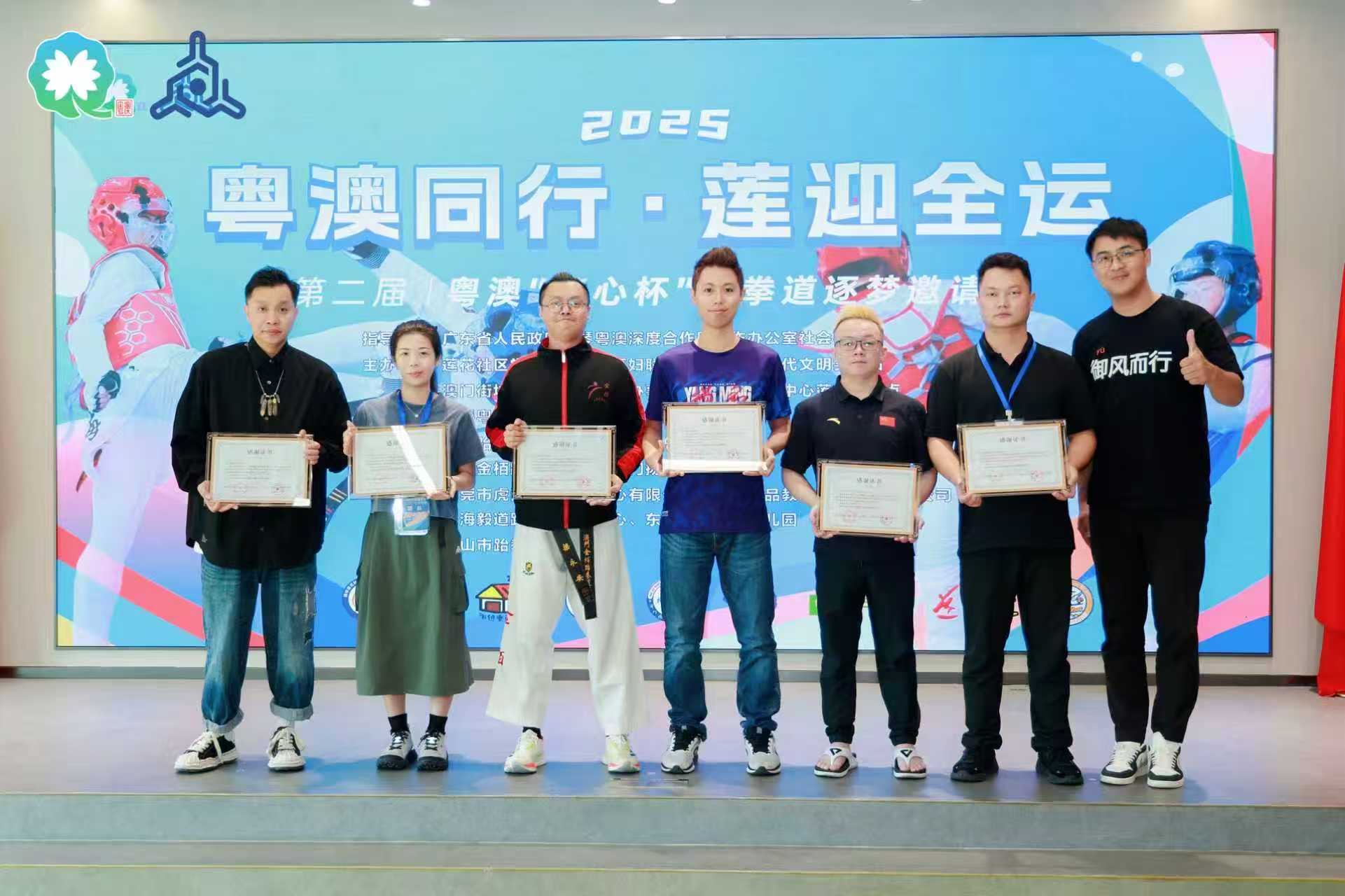 蓮花社區黨委書記李永慶、街坊總會廣東辦橫琴綜合服務中心副主任劉志鋒,以及來自粵澳兩地的九支跆拳道隊伍出席活動。