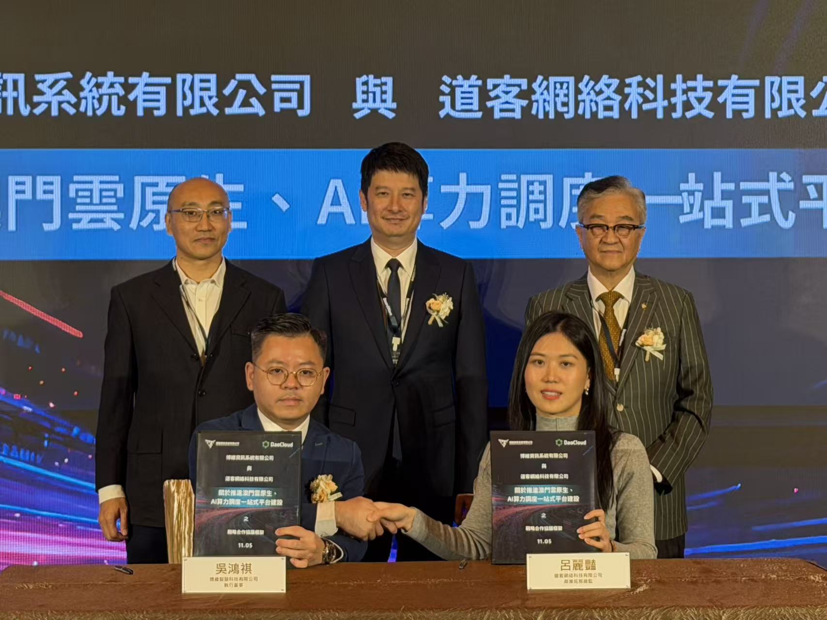 啟用儀式上博維資訊系統有限公司執行董事吳鴻祺與道客網絡科技有限公司商業拓展總監呂麗豔代表簽署關於推進澳門雲原生、AI算力調度、一站式平台建設的戰略合作。