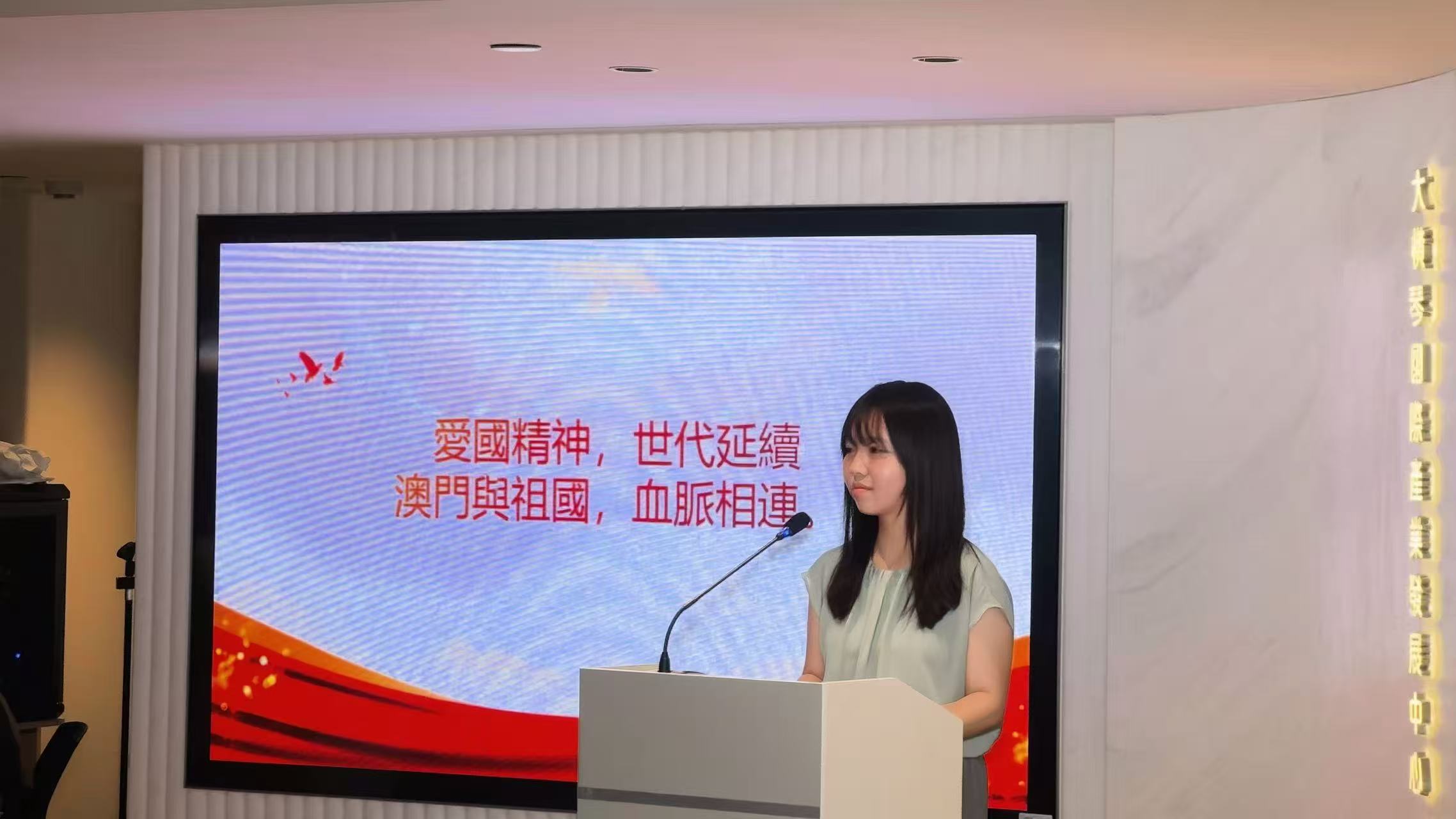 駱偉建以「傳承愛國精神,奮進新時代」為題,回顧了具有代表性的澳門抗戰人物、內地抗戰英烈及海外華僑華人的感人事跡,並就澳門愛國傳統在新時代的賡續與創新作了深入闡述。王曦以「抗戰文藝中的愛國火種」為主題,精選抗戰時期經典音樂作品,結合現場示範與講解,展現音樂在凝聚人心、鼓舞士氣方面的獨特作用。馬志容講述其先祖馬萬祺及多位澳門愛國領袖與青年的擔當故事,探討當代青年在傳承愛國精神過程中面臨的機遇與挑戰。