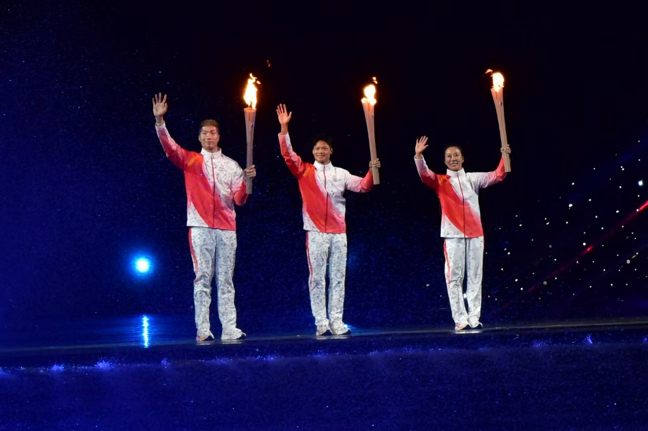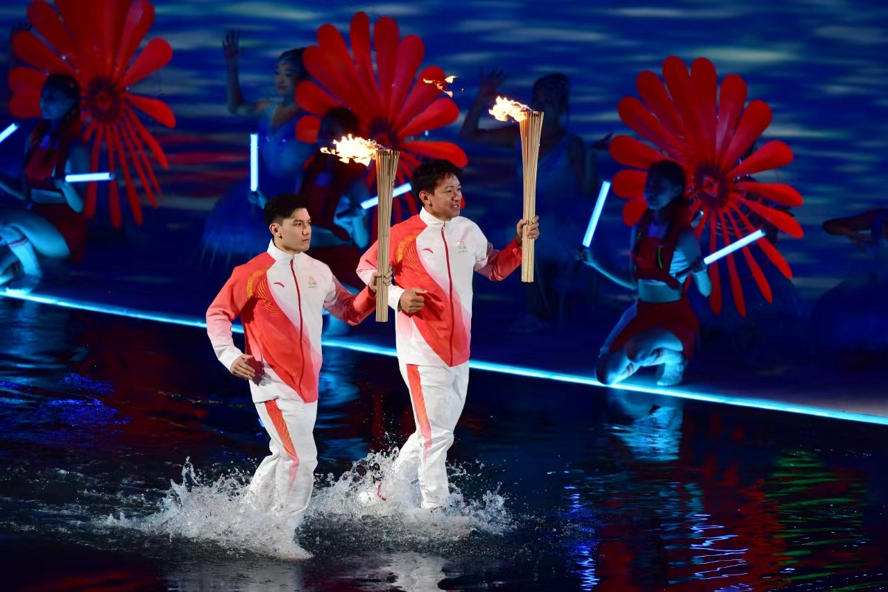 連串精彩文體藝匯演後,萬眾矚目的十五運會聖火點燃儀式正式開始,多名中國體壇名將及粵港澳三地運動員擔任火炬手,其中剛剛奪得今屆全運會空手道男子團體型金牌的方文浩(FONG MAN HOU)與香港運動員出任第二棒火炬手,而澳門史上首位亞運會女子金牌得主李禕(LI YI)則與廣東省和香港運動員擔任最後一棒火炬手,並一同點燃主火炬塔,宣告一連13天的全運會正式開始。