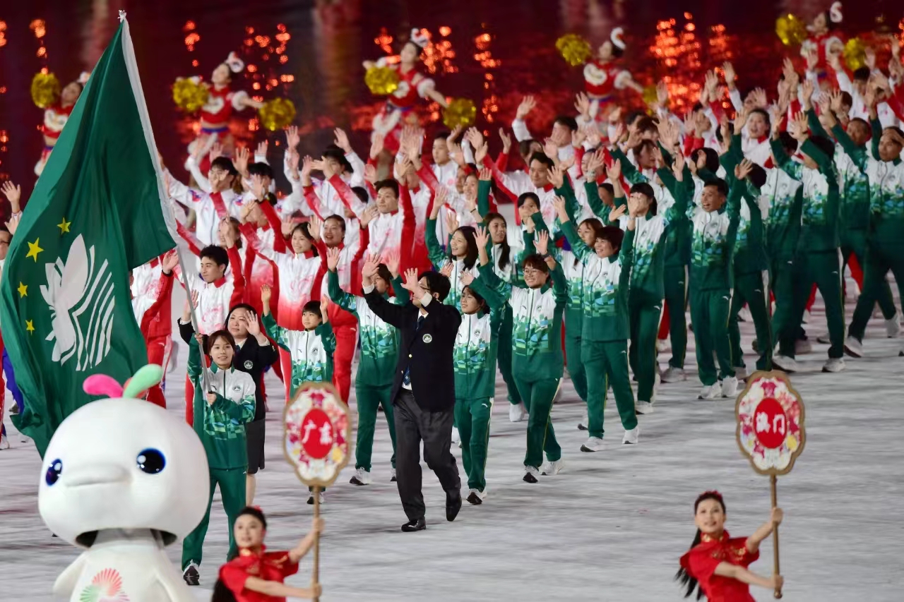昨(9)日晚上8時在廣東奧林匹克體育中心舉行了十五運會開幕式,席間由十五運會組委會執行主任、廣東省省長孟凡利主持,其後中央政治局委員、廣東省委書記黃坤明,十五運會組委會執行主任、香港特區行政長官李家超,十五運會組委會執行主任、澳門特區行政長官岑浩輝,以及十五運會組委會主任、國家體育總局局長高志丹先後致辭。開幕式上,各省市代表團參與了進場儀式,其中澳門體育代表團由武術運動員王泳欣(WONG WENG IAN)擔任持旗手,並聯同廣東省及香港體育代表團,一起以東道主身份壓軸出場,受到現場觀眾的熱烈歡迎。