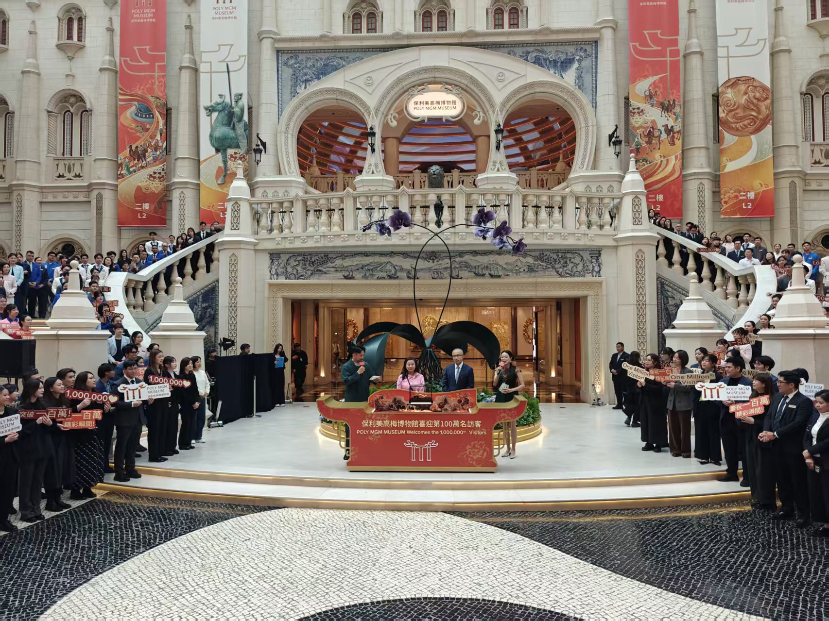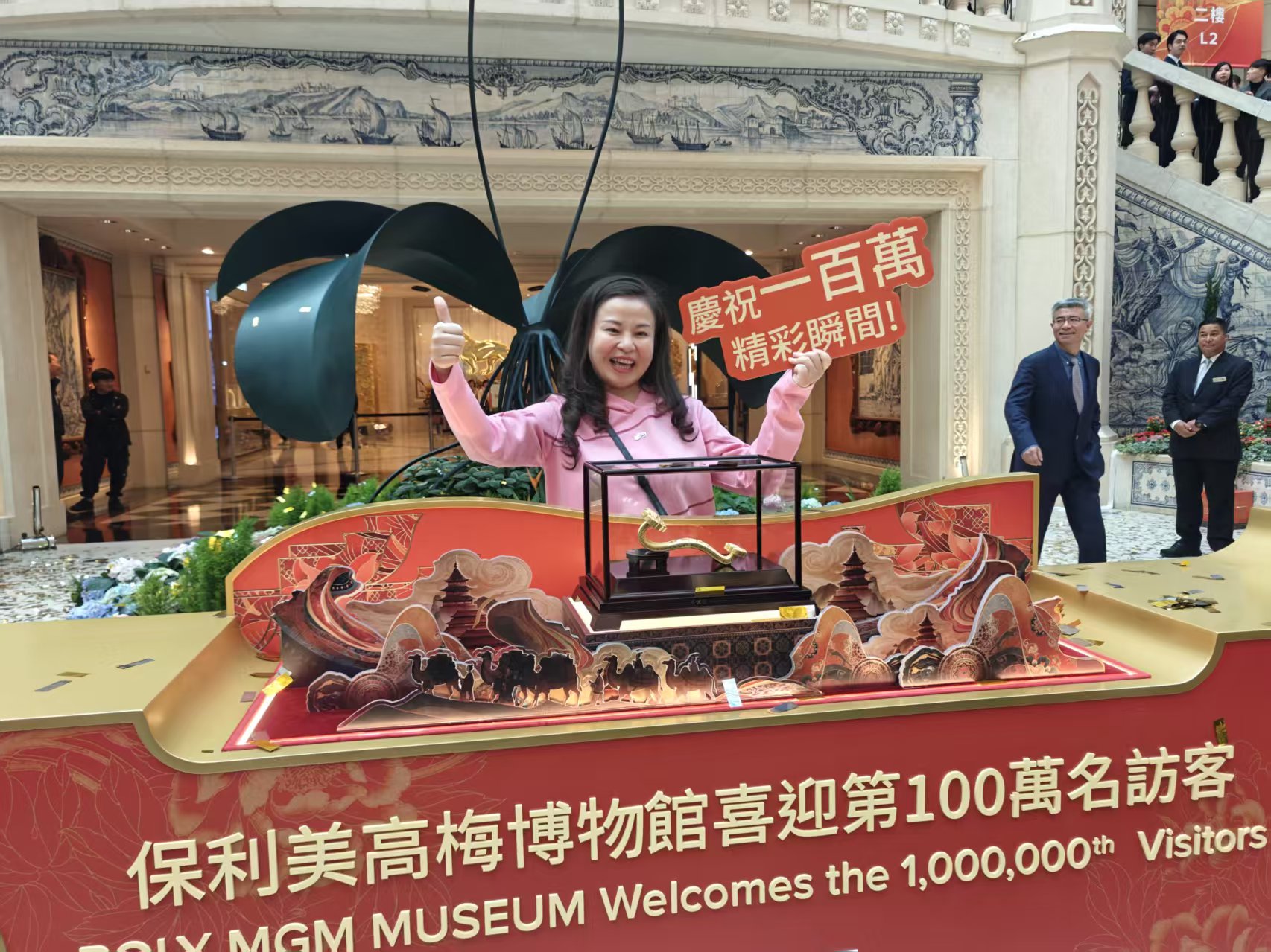 【即時新聞】保利美高博物館自啟幕以來,深受社會各界及海內外旅客歡迎,展現文化傳承魅力與創新策展實力,成功吸引來自本澳、香港、內地及全球逾40個國家和地區的觀眾到訪。博物館於今日喜迎第100萬名訪客,邁向重要里程碑。為誌慶這一時刻,美高梅中國控股有限公司總裁及執行董事馮小峰視臨現場,向該名幸運訪客送上100克的「足金如意」,寓意「吉祥如意、文脈永續」,現場過100名美高梅團隊成員共同見證這一喜悅時刻,氣氛熱烈溫馨。