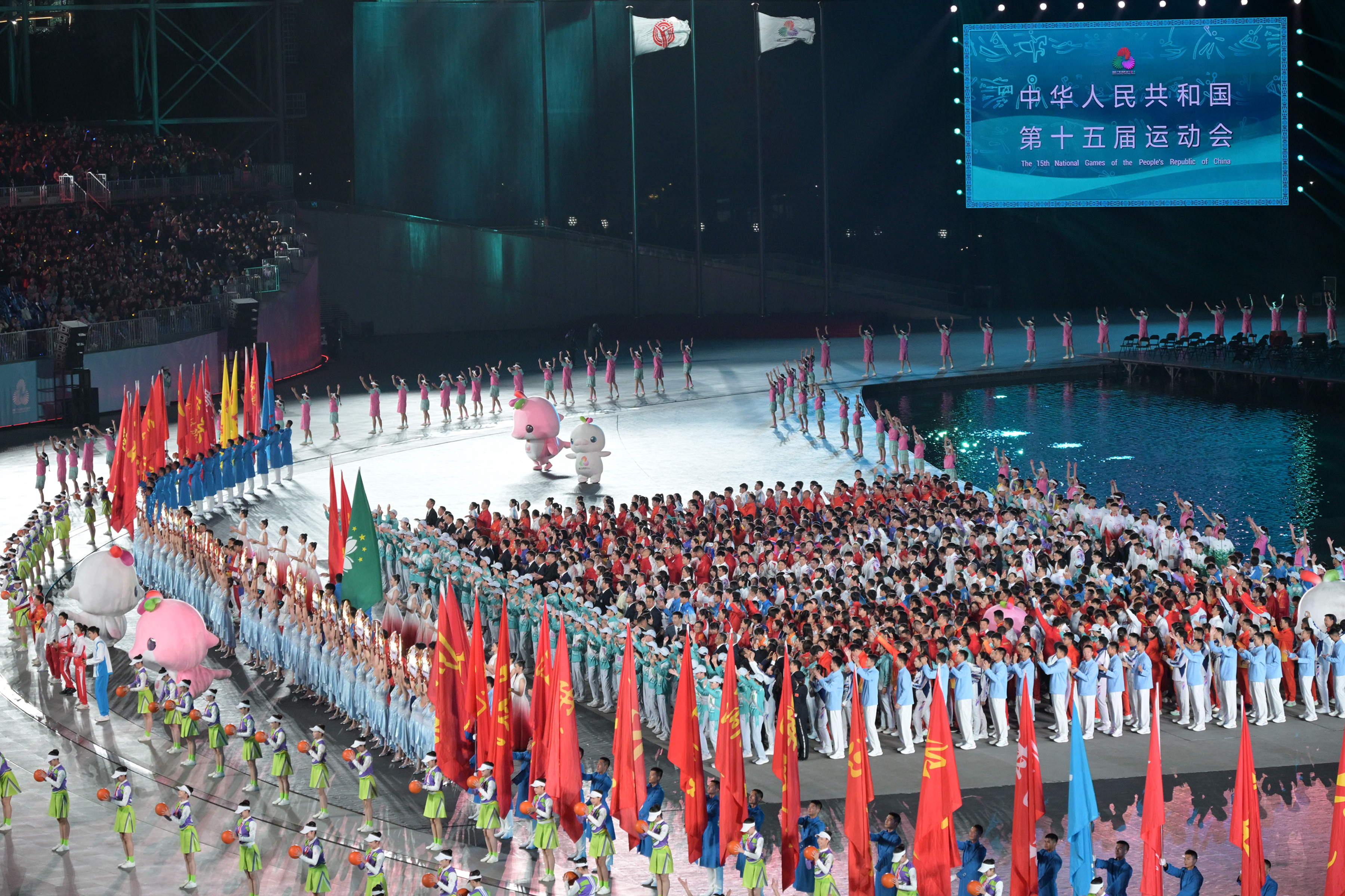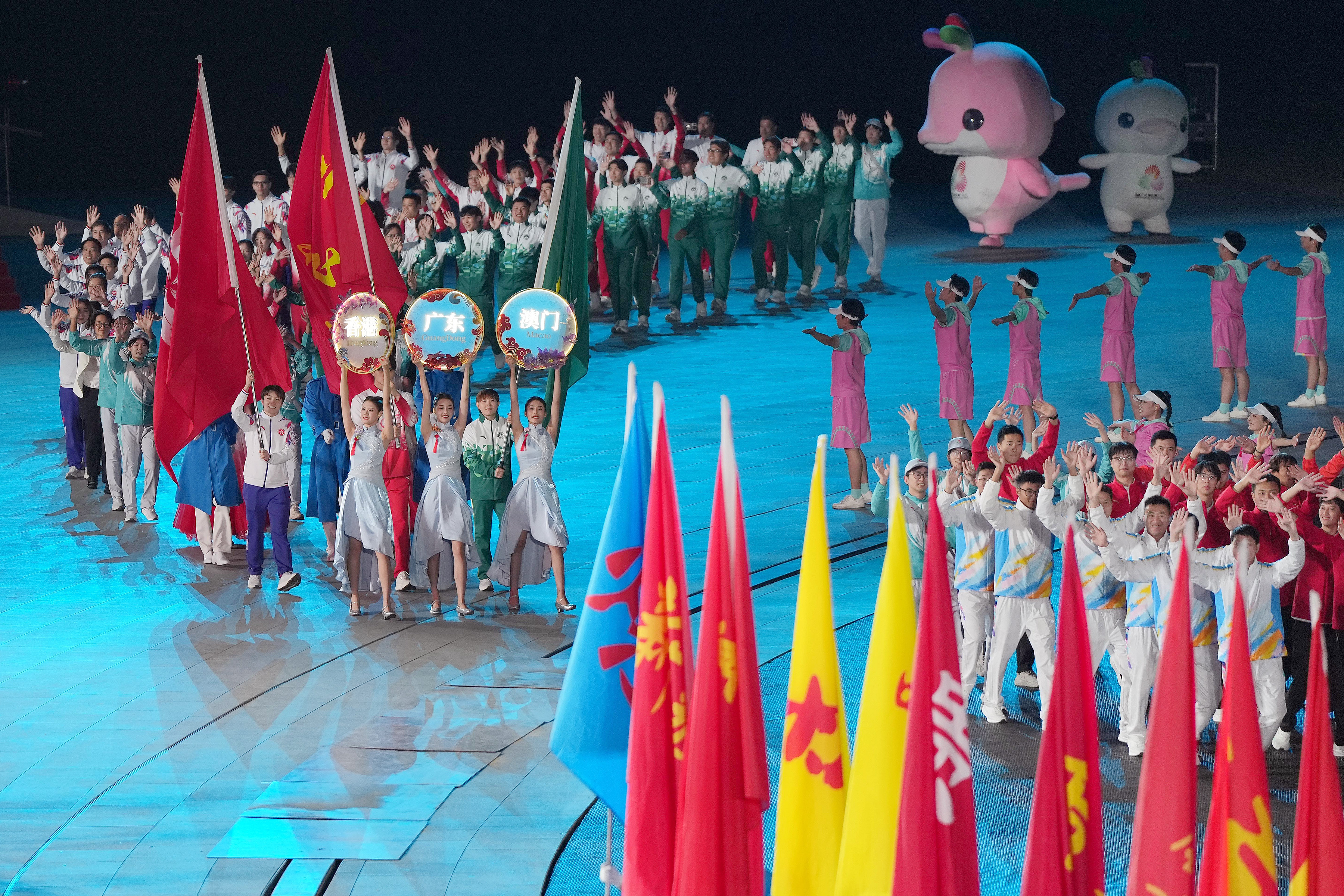 隨後進行了全運會會旗交接儀式,十五運會組委會3位執行主任,澳門特區行政長官岑浩輝、香港特區行政長官李家超、廣東省省長孟凡利先後接過會旗,並交予十五運會組委會主任、國家體育總局局長高志丹,最後由局長高志丹將會旗移交予湖南省省長毛偉明,標誌著2029年在湖南省舉行的十六運會籌備工作正式啟動。