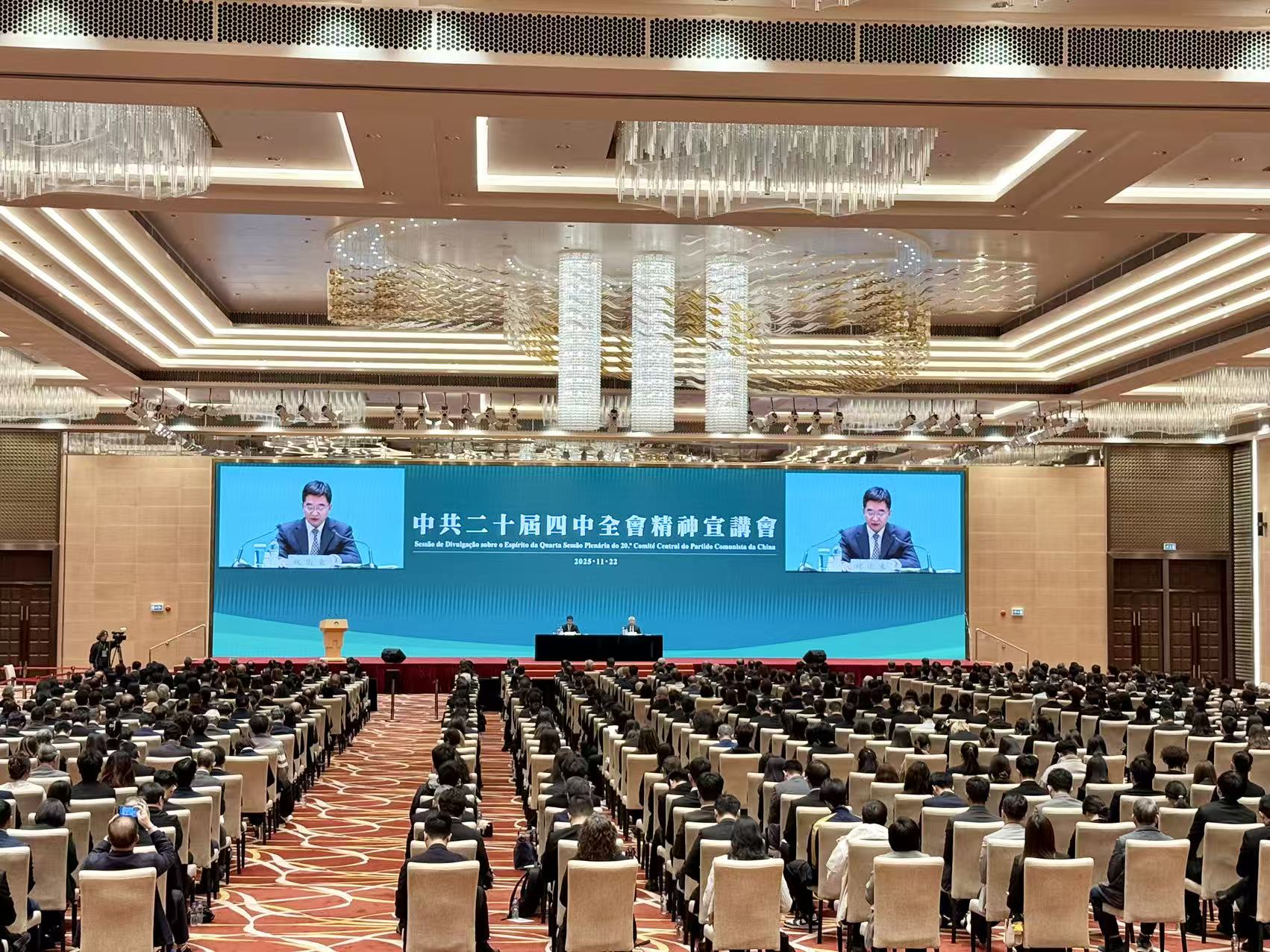 【即時新聞】澳門特區政府今日下午三時舉辦第二場「中共二十屆四中全會精神宣講會」,繼續由中央港澳工作辦公室、國務院港澳事務辦公室邀請的中央宣講團成員,中國科學院院長、黨組書記侯建國和中央宣講團成員,中央財經委員會辦公室副主任、中央農村工作領導小組辦公室副主任祝衛東,向本澳社會各界人士代表宣講全會精神。
