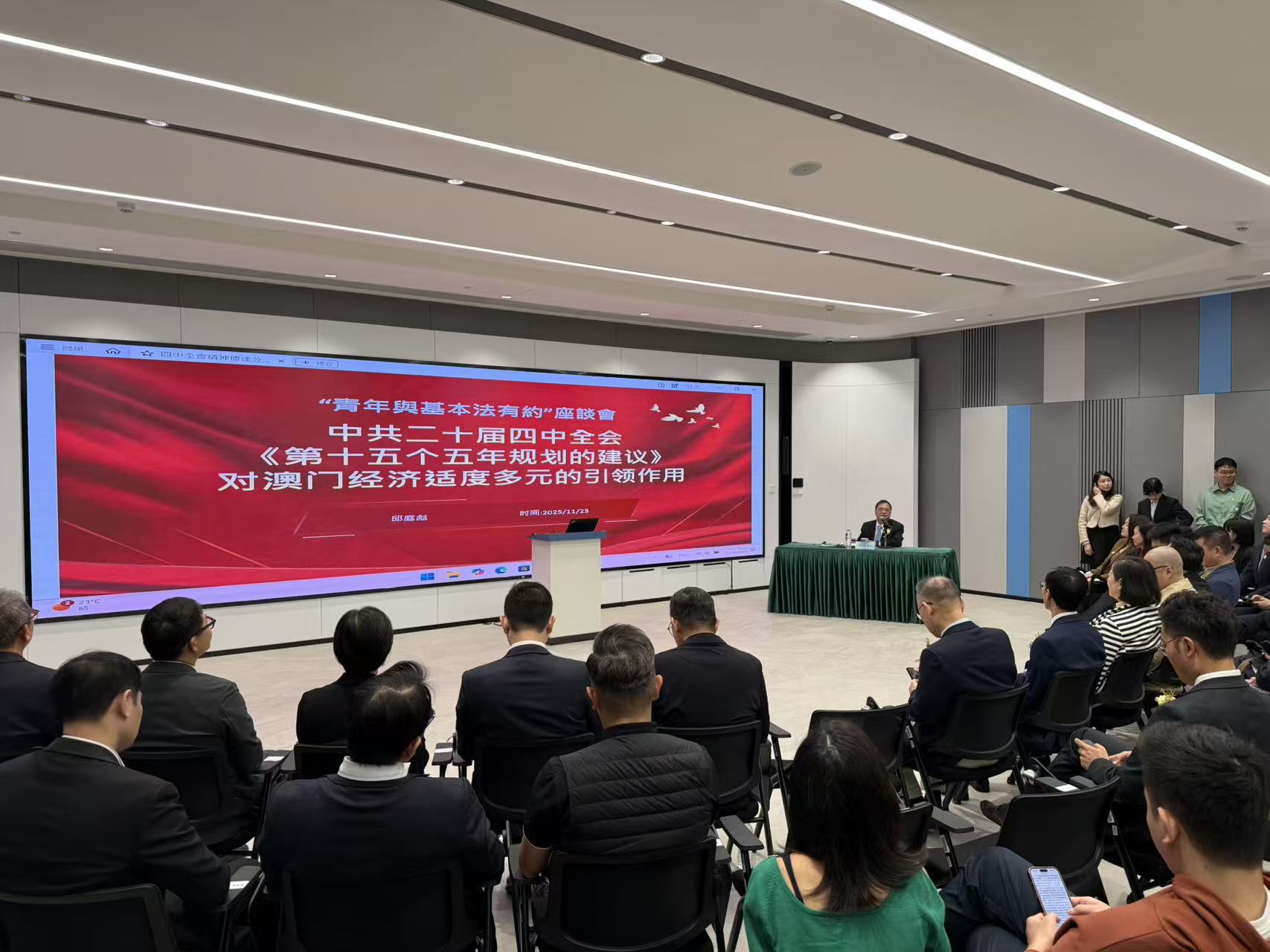 是次座談會設三個環節“四中全會精神傳達分享講話”、“憲法與基本法主題演講”以及“與青年代表交流座談”,冀藉此加深青年對國家憲法及澳門基本法的認識,加強對祖國和澳門的歸屬感及認同感,提高年青一輩的公民、政治意識。邱庭彪以中共二十屆四中全會《第十五個五年規劃建議》對澳門經濟適度多元發展的引領作用為題,分享包括落實《建議》提到科技自立自強目標,澳門推動科技創新與四大重點產業深度融合,以前瞻性法律設計保障創新成果轉化,助力產業升級等內容。賴冠儒以“從辯證法認識中國憲法的錨定作用”為題,探討新時代背景下,青年如何為推廣基本法注入新思維與活力。