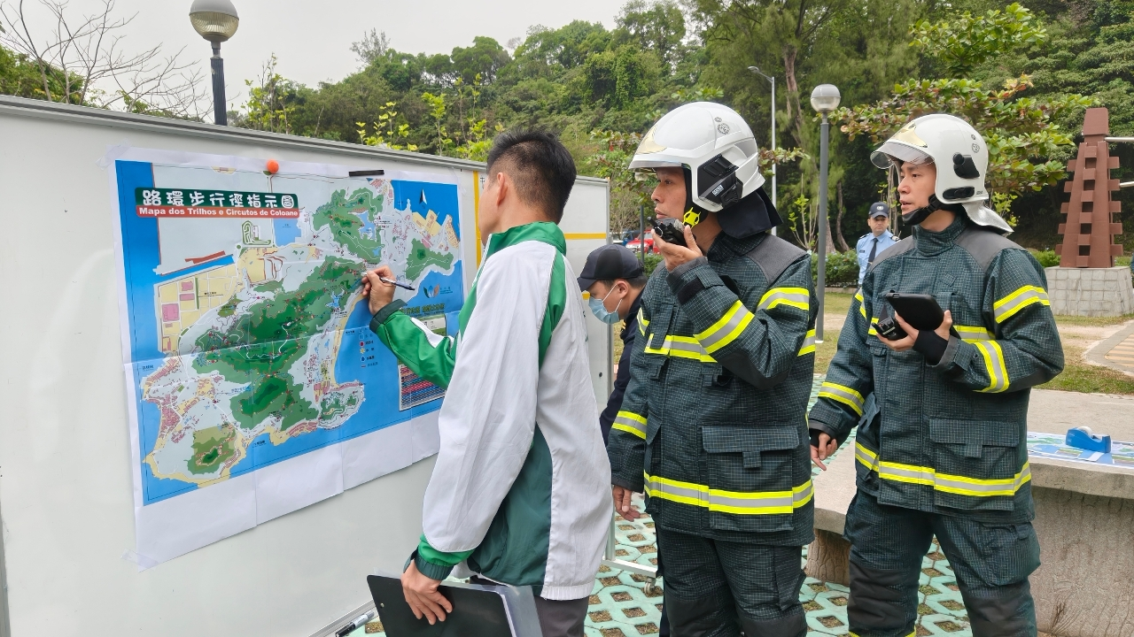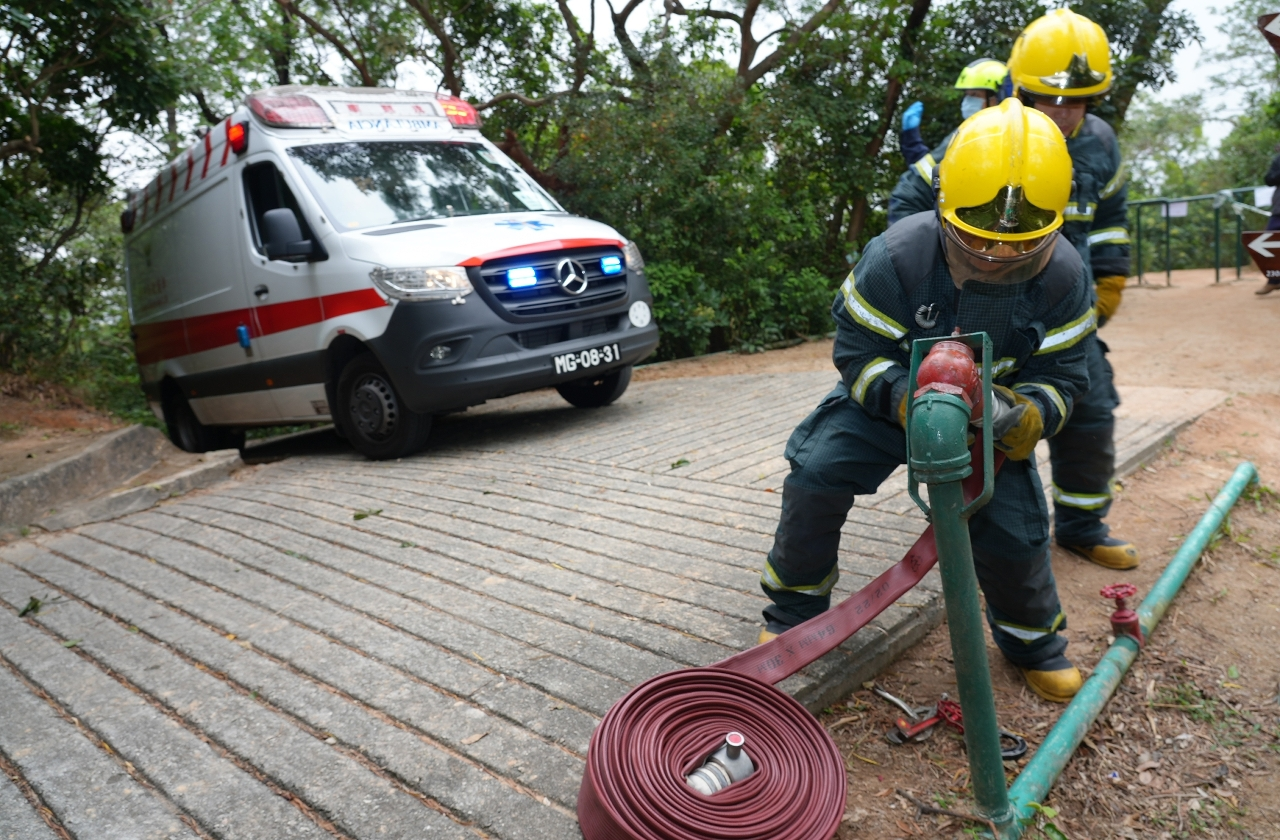 【即時新聞】為加強山林消防安全,提高在發生事故時的應變及協調溝通能力,消防局今(4)日上午,聯同市政署及治安警察局,在路環九澳高頂馬路家樂徑位置進行山火應急聯合演習。