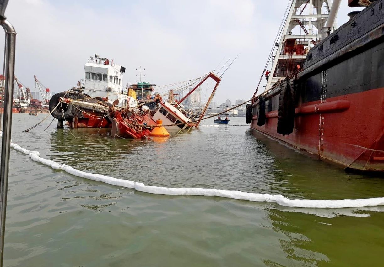 由於傾側漁船漏出少量油污,海事局啟動防溢油機制,佈置吸油條,現已完成清理。
