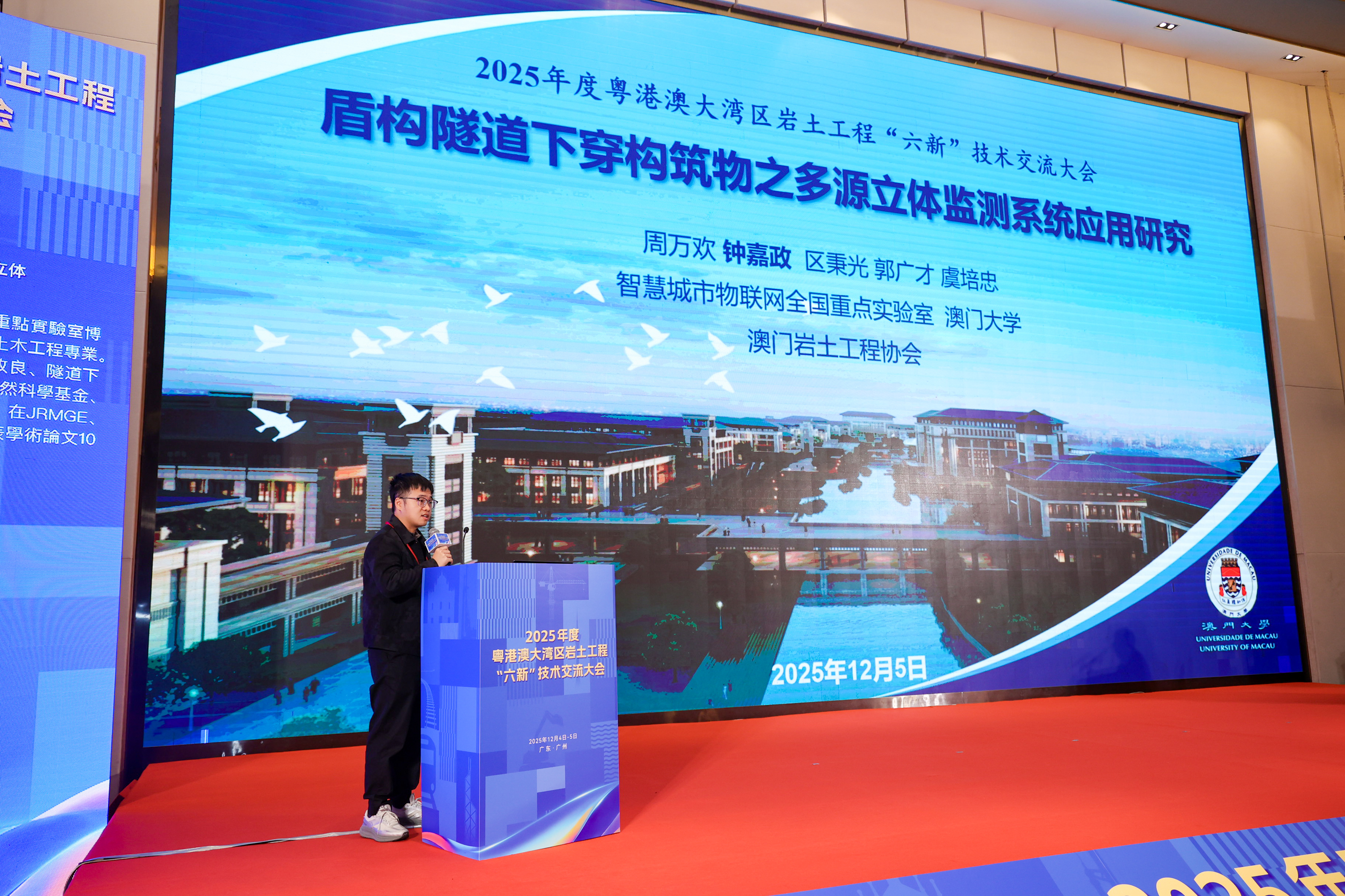 二、特邀主題報告精彩紛呈,權威專家分享前沿研究成果。本次大會彙聚了粵港澳三地岩土工程領域的頂尖專家,省內所有的院士大師教授大咖悉數到場作技術分享或做單元報告控場主持,其中來自澳門岩土工程協會的代表鍾嘉政進行了主題報告《盾構隧道下穿構築物之多源立體監測系統應用研究》。