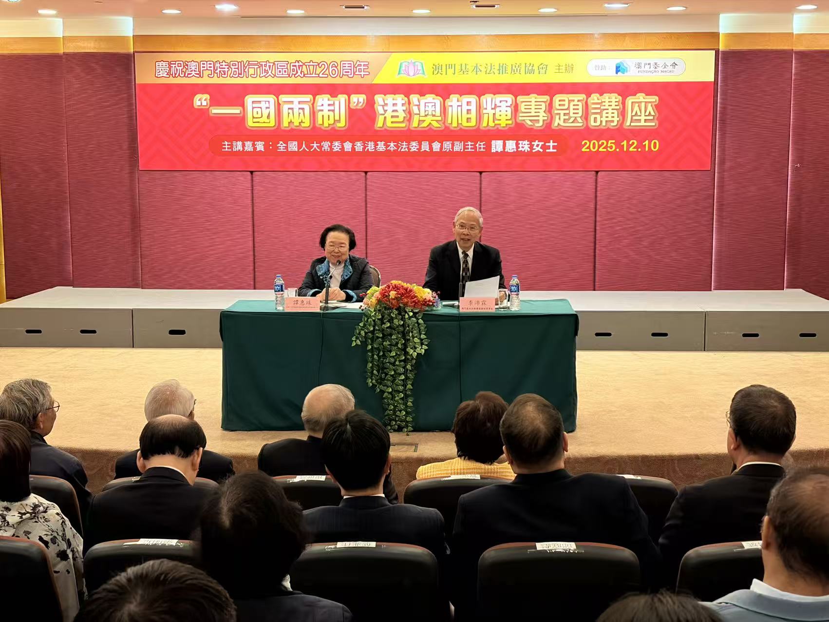 【即時新聞】澳門基本法推廣協會主辦之慶祝澳門特區成立26周年「一國兩制」港澳相輝專題講座下午假中華總商會何賢先生紀念堂舉行,邀請全國人大常委會香港基本法委員會原副主任譚惠珠到場主講,圍繞「一國兩制」理論創新與實際發展等議題展開詳盡分享,逾200名政府部門代表、學生和社會人士參與。