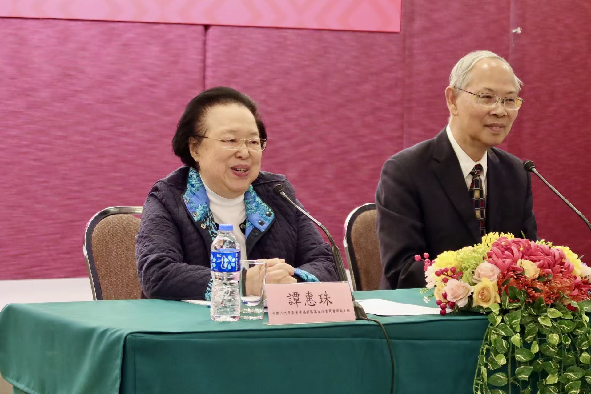 會上,譚惠珠回顧了香港基本法實施27年來的歷程,重點對比港澳在「一國兩制」下的實踐差異,包括行政主導體制、國家安全立法等方面。她提到,澳門基本法明確確立「行政主導」體制,行政長官及其團隊在施政決策及推動政策方面佔主導地位,立法會由直選、間選及委任議員組成,兼顧民意與治理效率。
