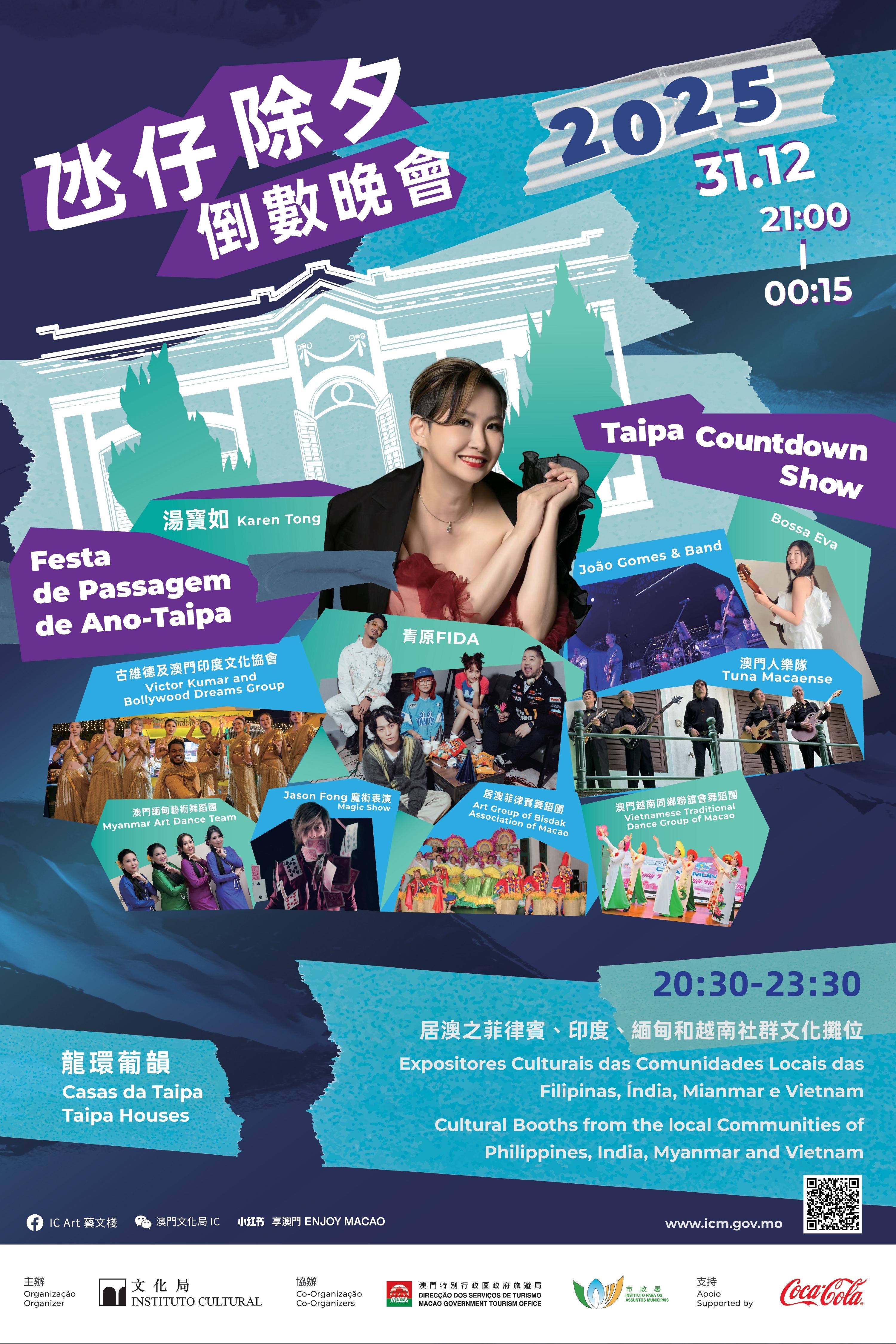 同晚,“2025氹仔除夕倒數晚會”將在龍環葡韻舉行,晚會以多元文化共融為主軸,邀請香港歌手湯寶如擔任壓軸演出嘉賓,並獻唱多首經典歌曲;本地音樂單位:青原、澳門人樂隊、Bossa Eva與João Gomes & Band亦將獻唱帶動現場氣氛。此外,一系列文化特色演出展現城市多元魅力,包括古維德及澳門印度文化協會、居澳菲律賓舞蹈團、緬甸藝團、越南藝團將分別帶來現代與傳統歌舞表演,以及魔術師馮兆恆表演魔術。晚上8時30分至11時30分,現場設有特色文化攤位,由居澳之菲律賓、印度、緬甸及越南社群展示當地傳統服飾、旅遊資訊、地道小食及飲品,彰顯澳門族群文化共融、和諧共處的都市生活氛圍。