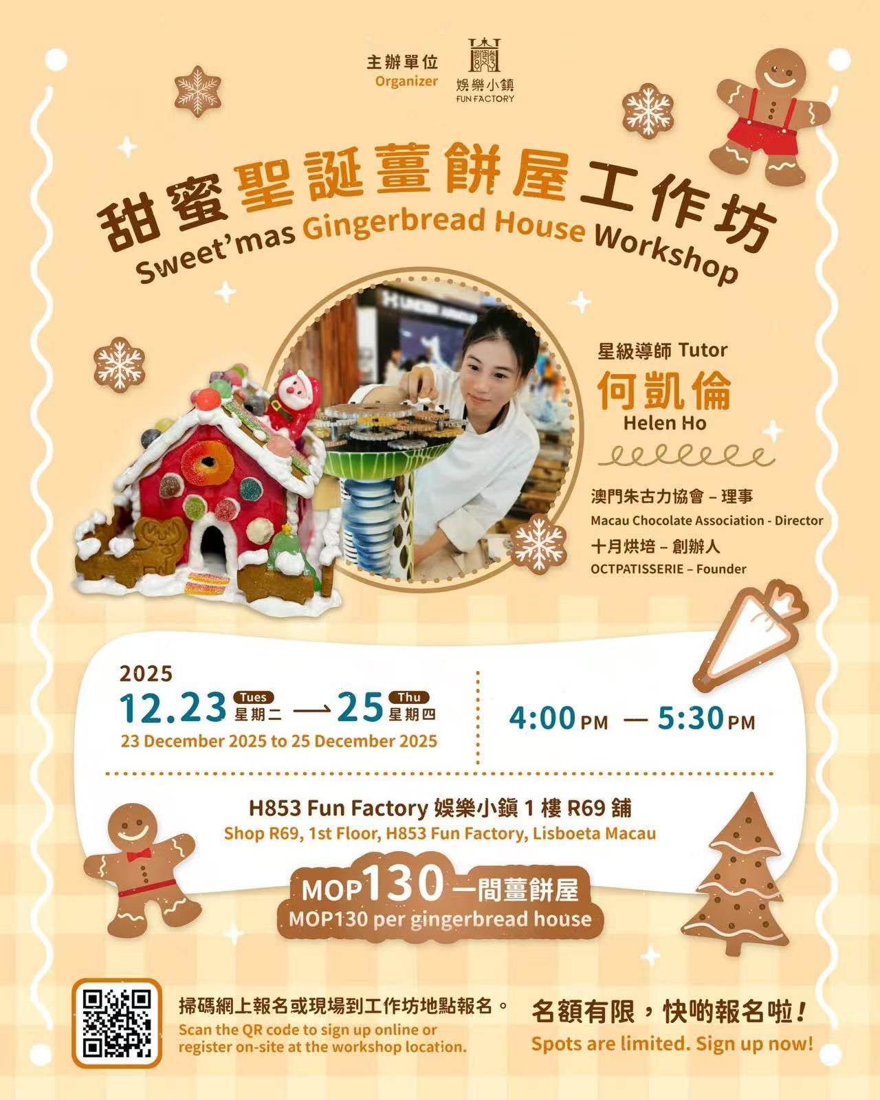 其中,甜蜜聖誕市集於12月20-21日每天14:00-20:00,呈現眾多本地聖誕文創小物、聖誕甜品等攤位,打造寵物友善空間邀請訪客和毛孩蒞臨。12月20、21、24及25日每天15:30-16:15更帶來精彩的聖誕精靈高蹺空中派對;21日至25日14:00-18:00將有聖誕老人與天使助手派糖送暖;暖心弦樂四重奏樂章將於21日至25日15:00-17:00奏響。12月23至25日16:00-17:30,H853 Fun Factory娛樂小鎮R69舖設有「甜蜜聖誕薑餅屋工作坊」供親子參與,名額有限,先到先得。