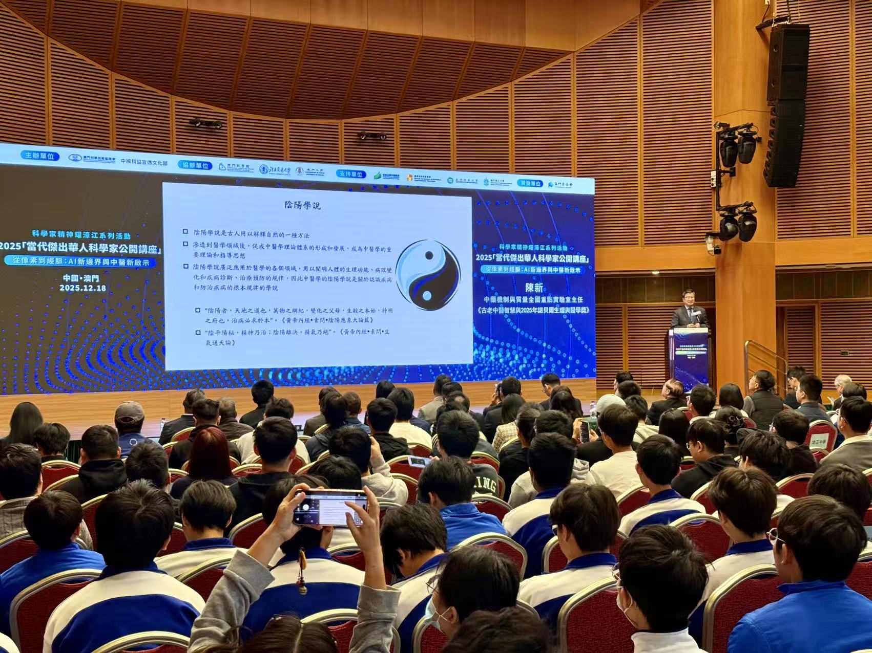 是次講座邀請中醫藥領域首個國家重點實驗室——中藥機制與質量全國重點實驗室主任陳新,以及北京交通大學教授趙耀分享關於中醫智慧及AI技術領域最新前沿科技發展信息與知識。中醫學作為中華文明的瑰寶,陳新從中醫的陰陽理論,深入解讀調節性T淋巴細胞的相關科學成果,進一步展示古老中醫智慧為現代免疫學與醫藥創新提供的獨特啟示,激勵著既要深耕傳統智慧寶庫,又要以開放心態擁抱現代科技創新,讓古老智慧在現代科技中煥發新生。陳新表示,中醫藥是中華民族優秀文化的精華部分,傳承相關文化是每位華人的責任,青少年應自覺加強中醫藥方面的知識,他認為澳門在相關教育方面做得很好,建議政府組織更多社區專題講座和夏令營等,持續向青少年科普中醫藥知識。