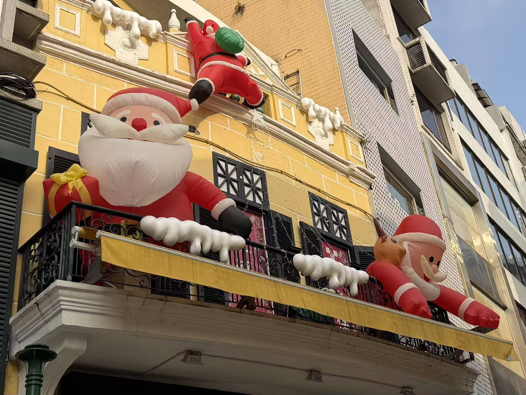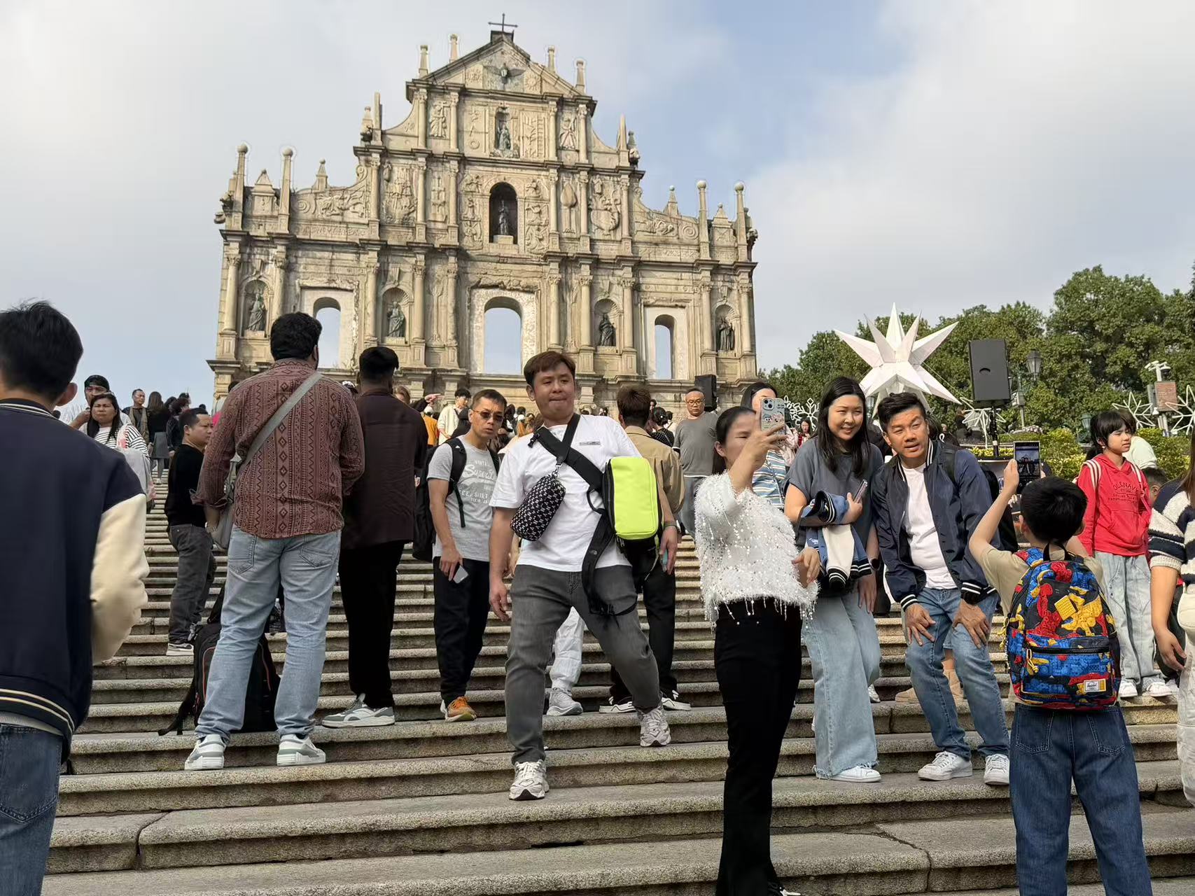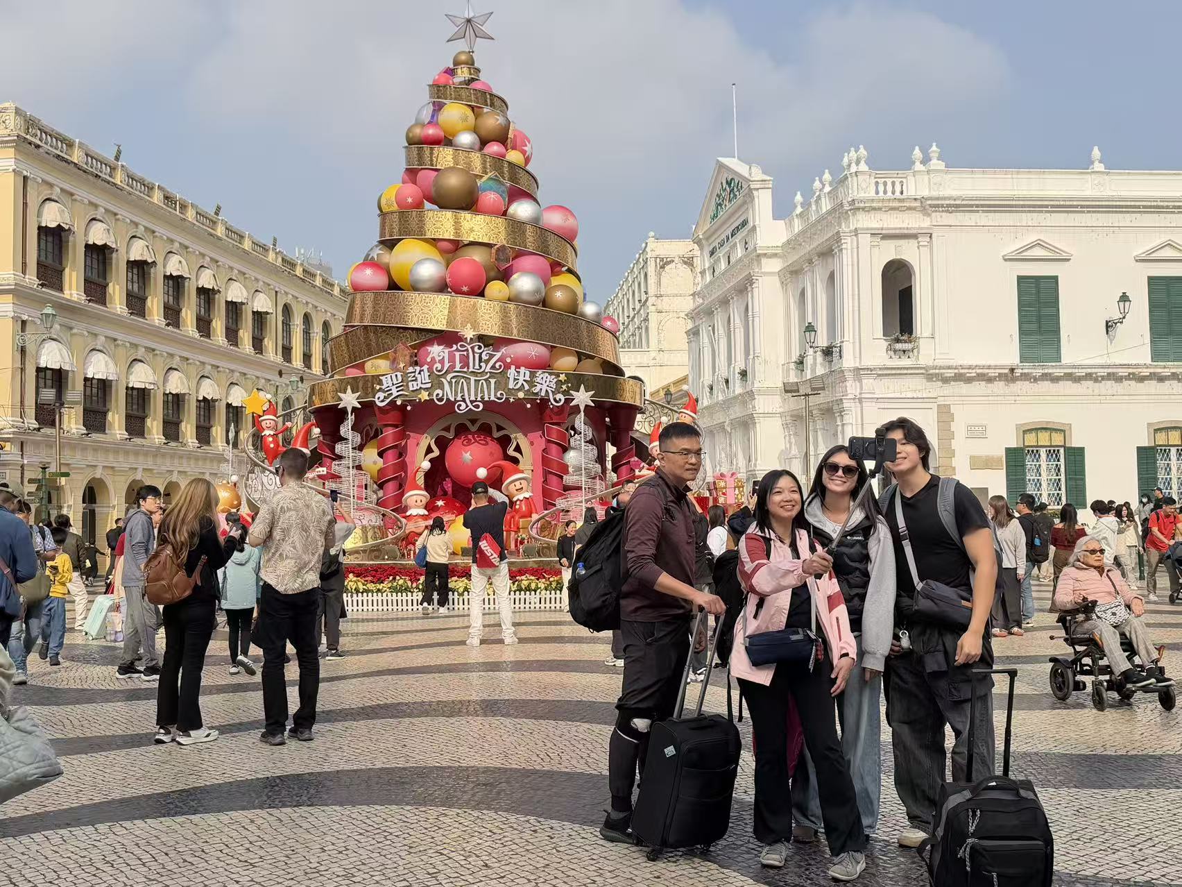 假日裡的景區氣氛熱鬧,旅客絡繹不絕,大三巴附近手信店客流也有增多,店員們不停地遞送試吃。周邊街巷不少商鋪也佈置了許多聖誕裝飾,吸引旅客紛紛駐足。