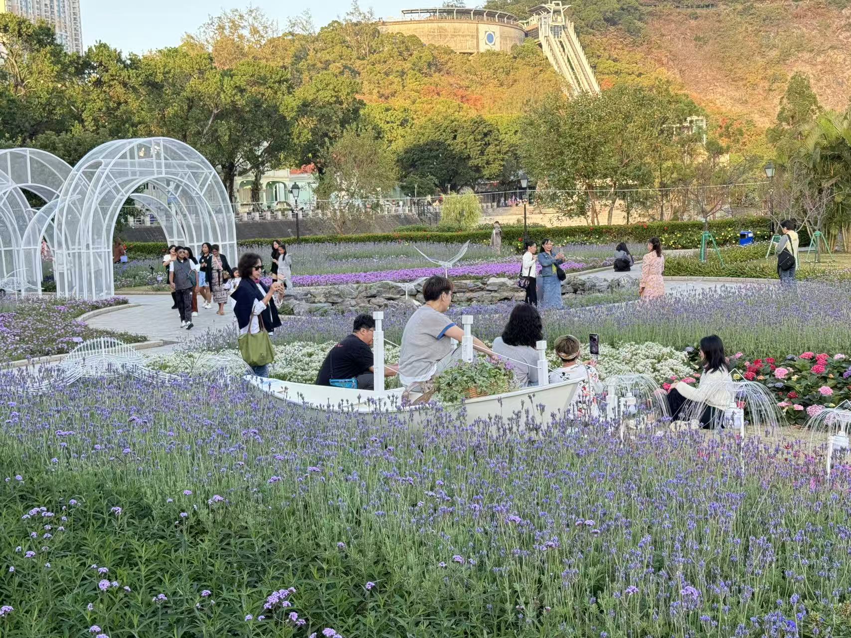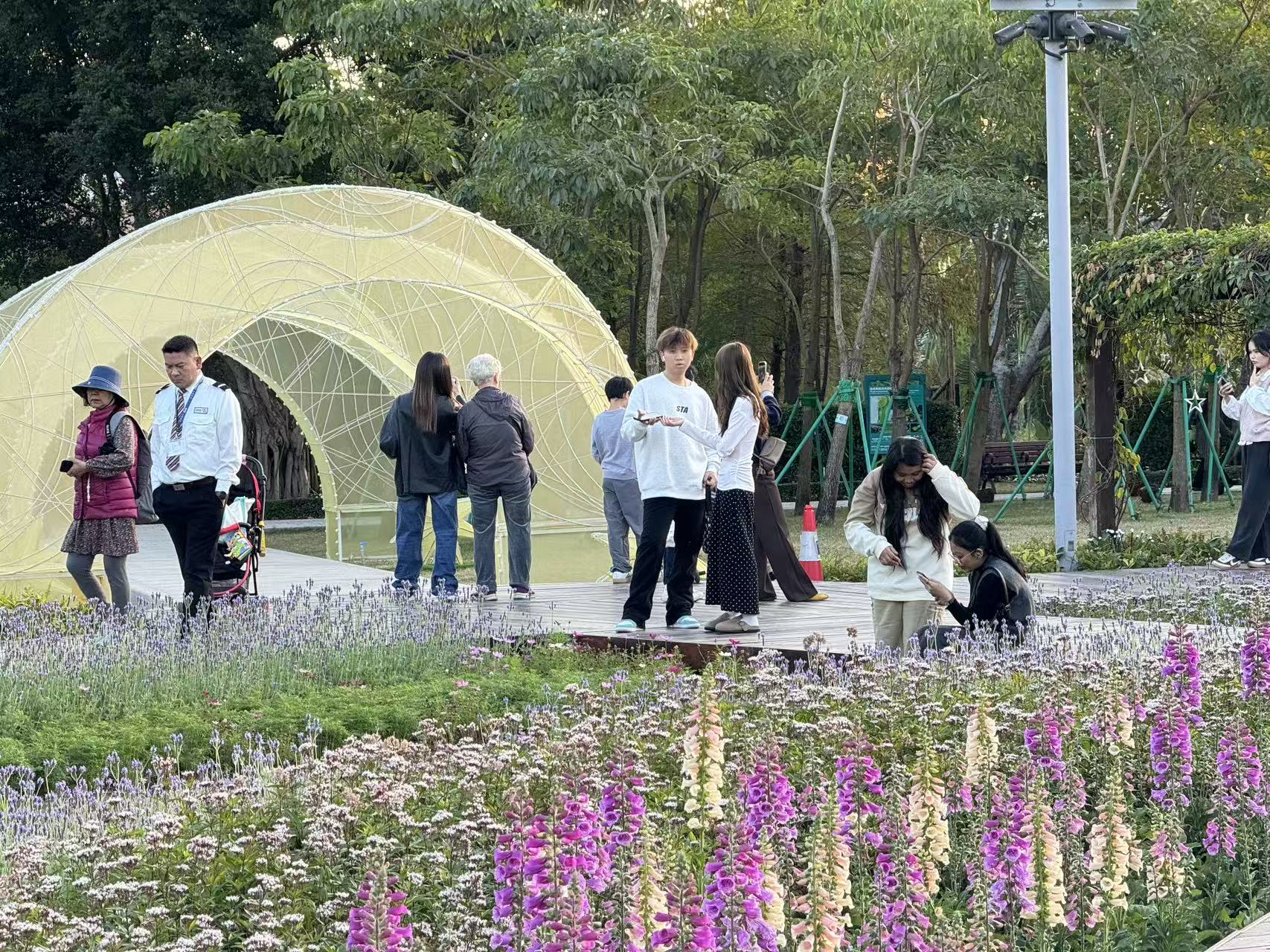 龍環葡韻一帶早已換上浪漫紫衣,薰衣草、超級鼠尾草、大花飛燕草、魯冰花、毛地黃等花卉匯聚成紫色花田。不少遊人駐足觀賞,或俯身輕聞花香,或舉起手機捕捉花姿。小朋友在花徑間穿梭追逐,父母依偎在花叢旁合影,留下甜蜜瞬間;亦有長者悠閒漫步,享受暖陽與繁花的時光。