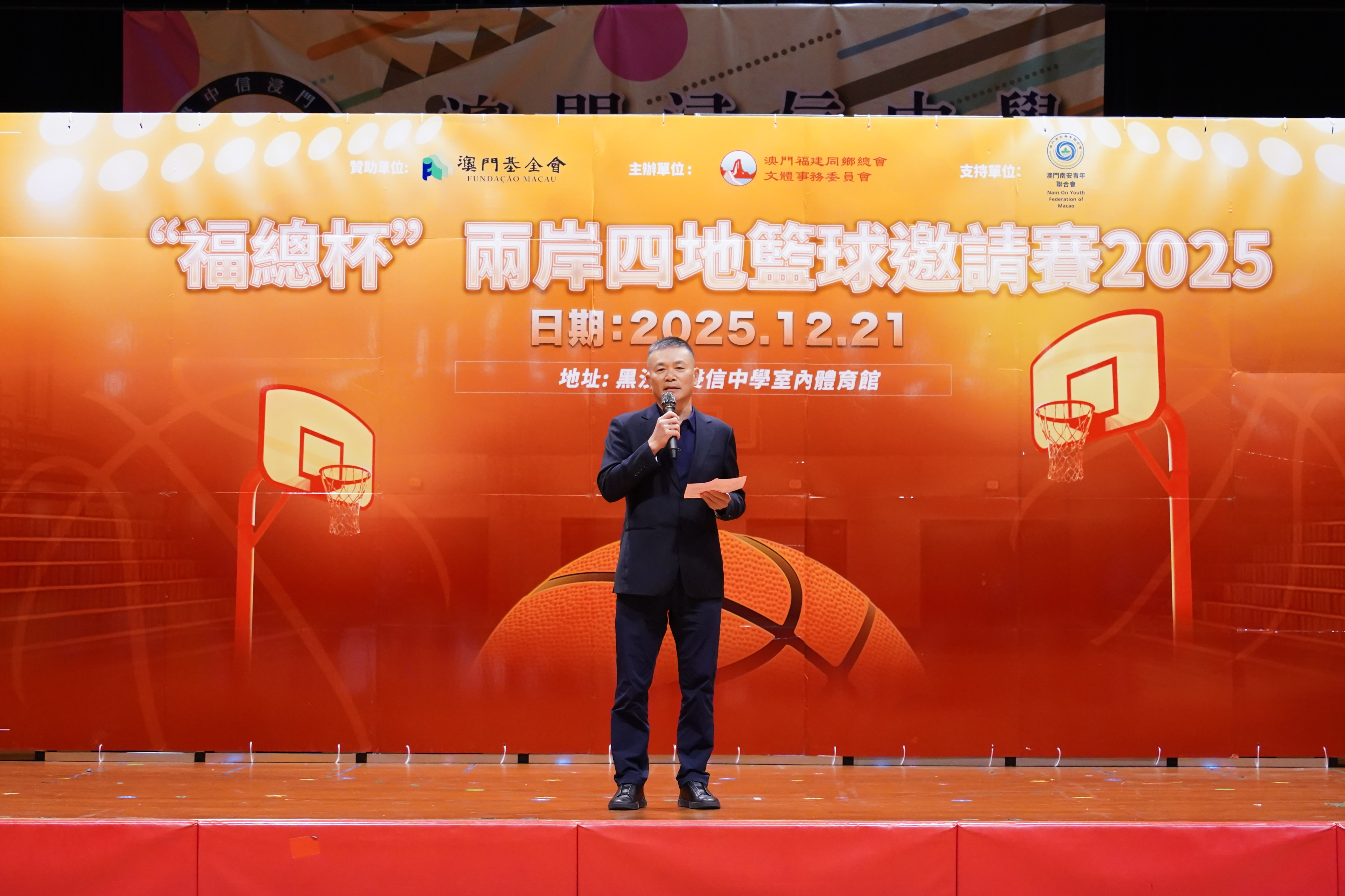 澳門福建同鄉總會理事長黃天松在致辭中表示,本次賽事以籃球為橋樑,不僅展現了球員的技術與拼搏精神,更促進了兩岸四地青年之間的了解與友誼。他感謝各代表隊的參與,以及裁判員、教練員及工作人員的付出,並強調體育交流對推動和諧發展具有積極意義,期待未來繼續透過賽事凝聚情誼、共建正向能量。