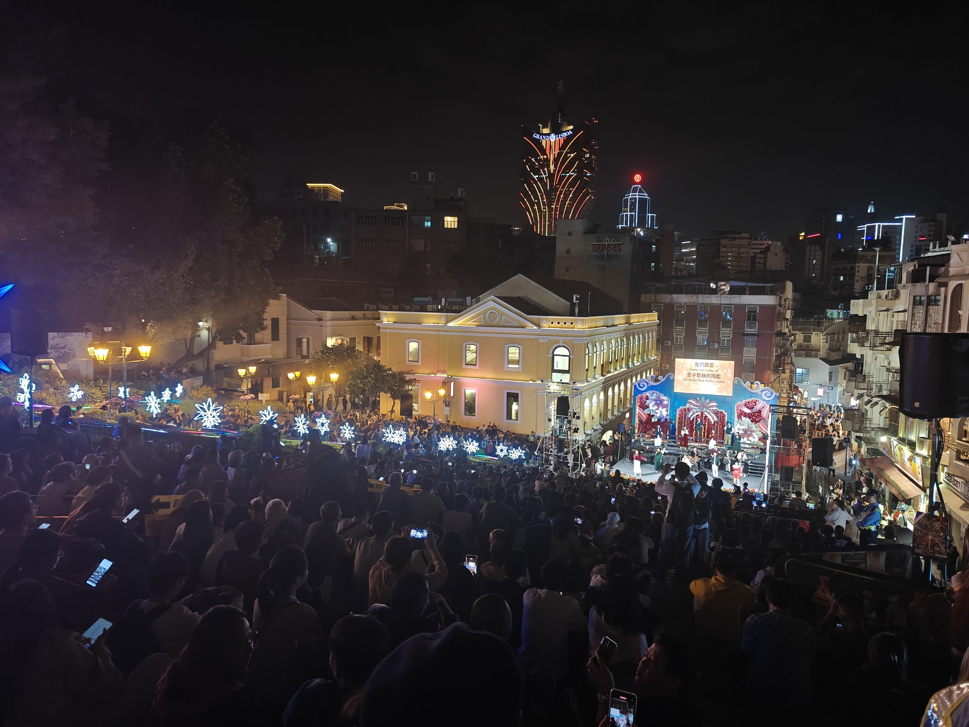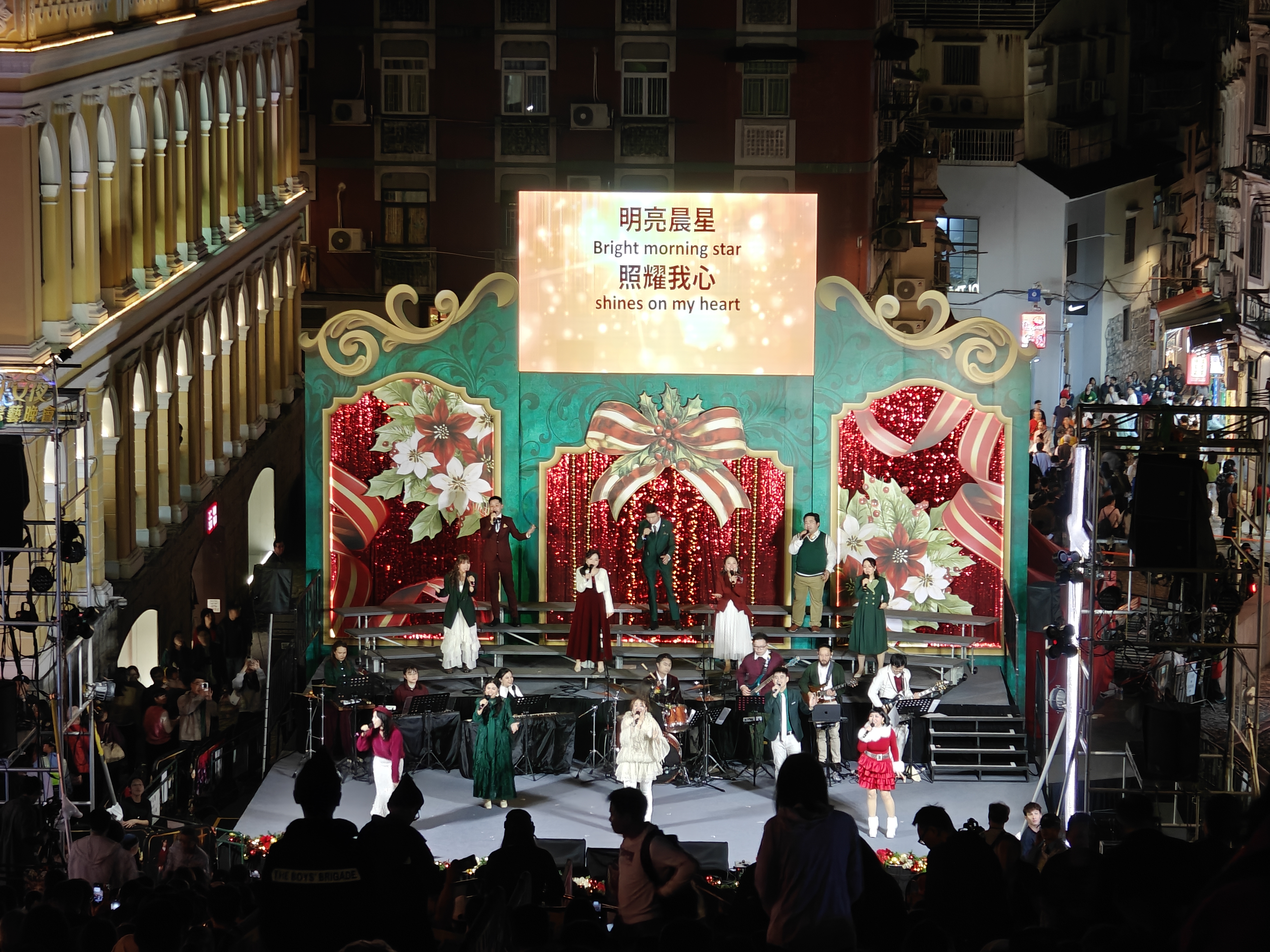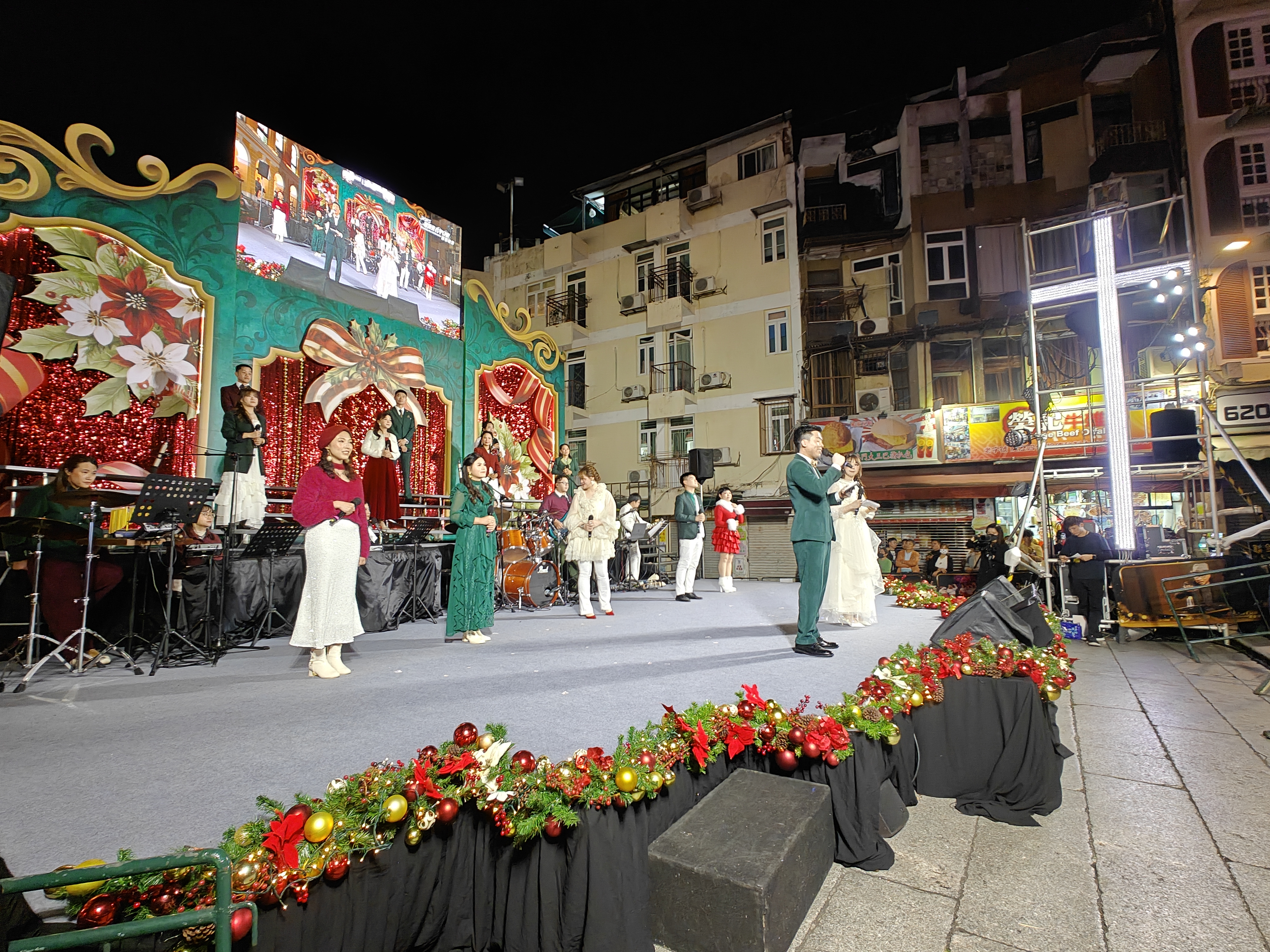 由澳門基督徒音樂協會主辦的「2025歡樂佳音平安夜」綜藝晚會今晚8時至12時假大三巴牌坊耶穌會廣場舉行,連續4小時的豐富綜藝節目,包括聖詩合唱團獻唱、現場樂隊演奏、兒少舞蹈獻唱、真愛爆笑 SHOW、青年舞蹈、默劇、現代劇場及合家歡互動遊戲等。大會祈盼藉此活動主題「當生命遇上愛」,當生命與真愛相遇時,便會帶來盼望、激勵與喜樂,潛能得以發揮,焦慮及自殺的念頭得以釋懷。活動吸引眾多市民及旅客到場觀賞,大三巴牌坊梯級坐滿觀眾,有警員及工作人員在場維持秩序,氣氛祥和熱鬧。