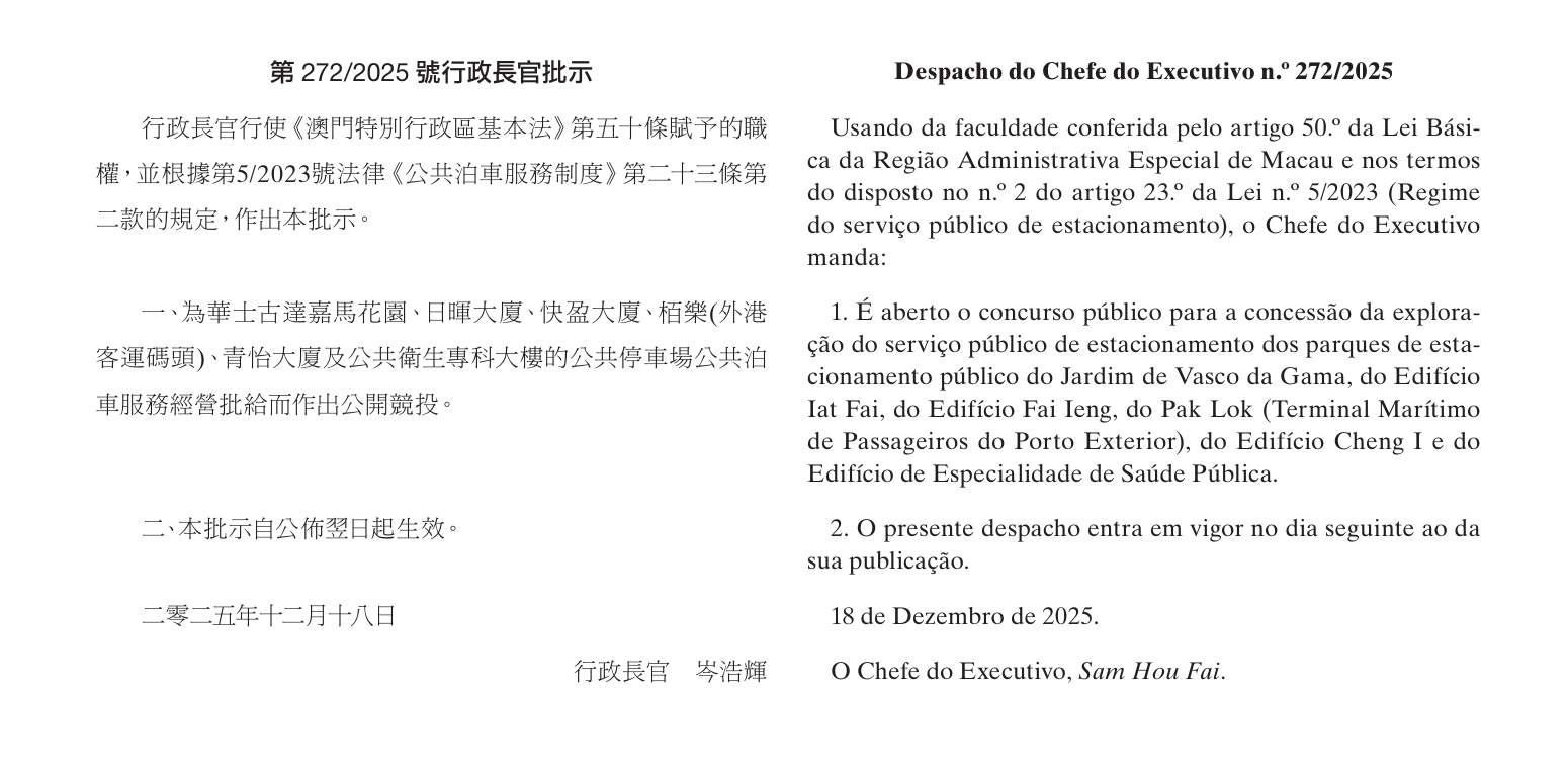 【即時新聞】今日政府公報刊登行政長官批示,華士古達嘉馬花園等6個公共停車場公共泊車服務經營批給作出公開競投。