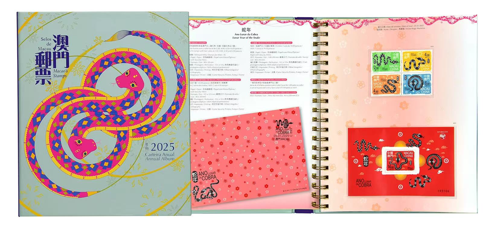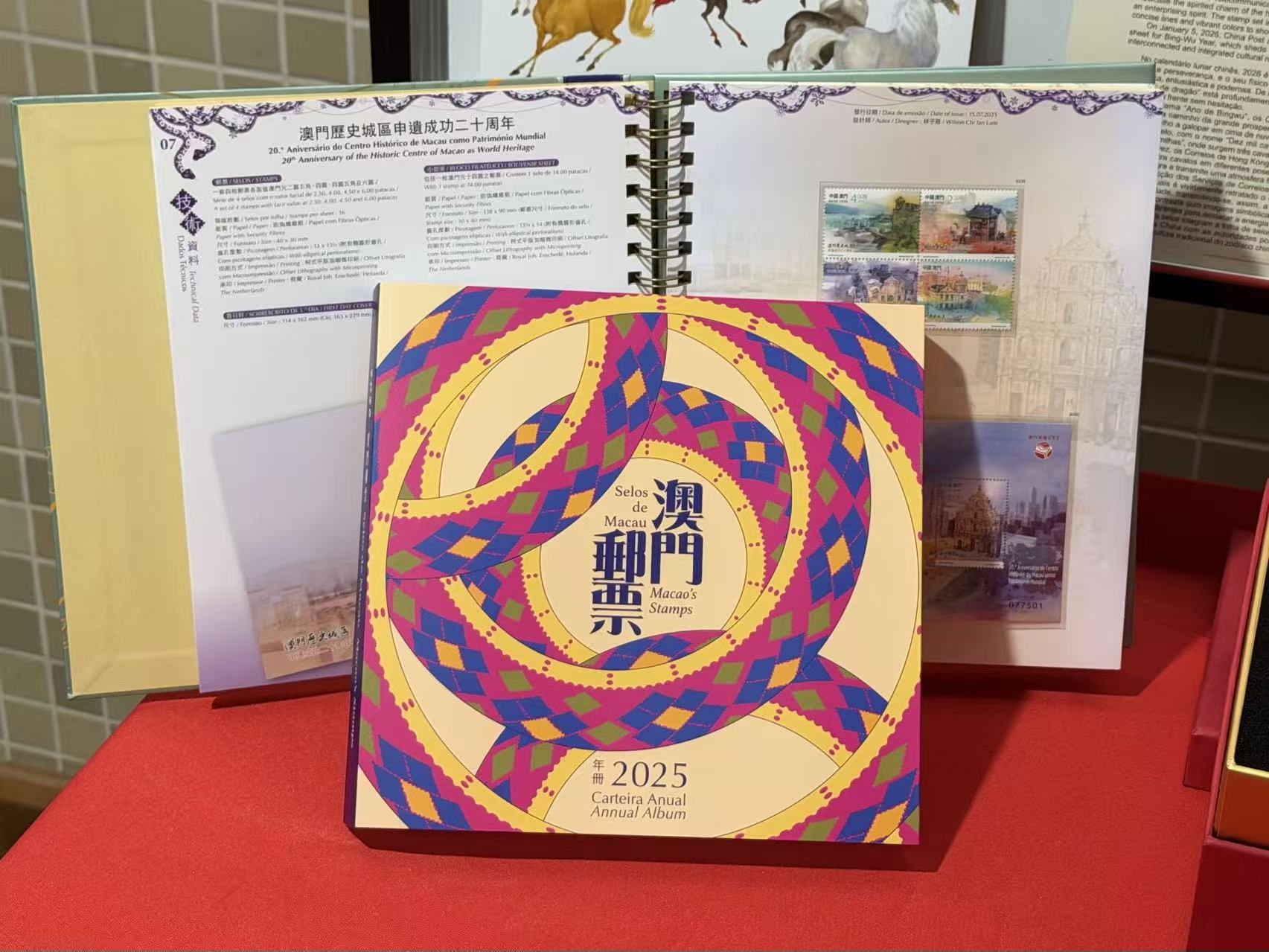 年冊載有2025年發行的14套郵票和10枚小型張,內頁以活頁形式呈現精美的澳門郵品,圖文並茂印有相關郵品的彩圖和技術資料。