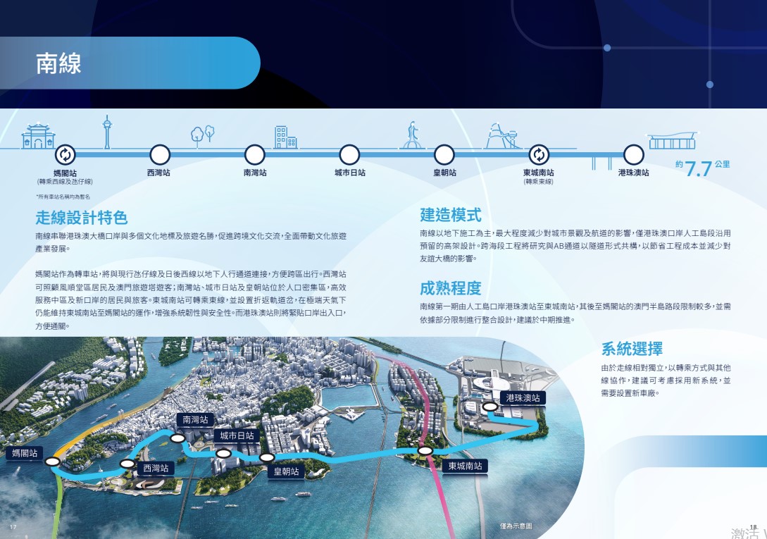 文本指出,南線第一期由人工島口岸港珠澳站至東城南站,其後至媽閣站的澳門半島路段限制較多,並需依據部分限制進行整合設計,建議於中期推進。由於走線相對獨立,以轉乘方式與其他線協作,建議可考慮採用新系統,並需要設置新車廠。