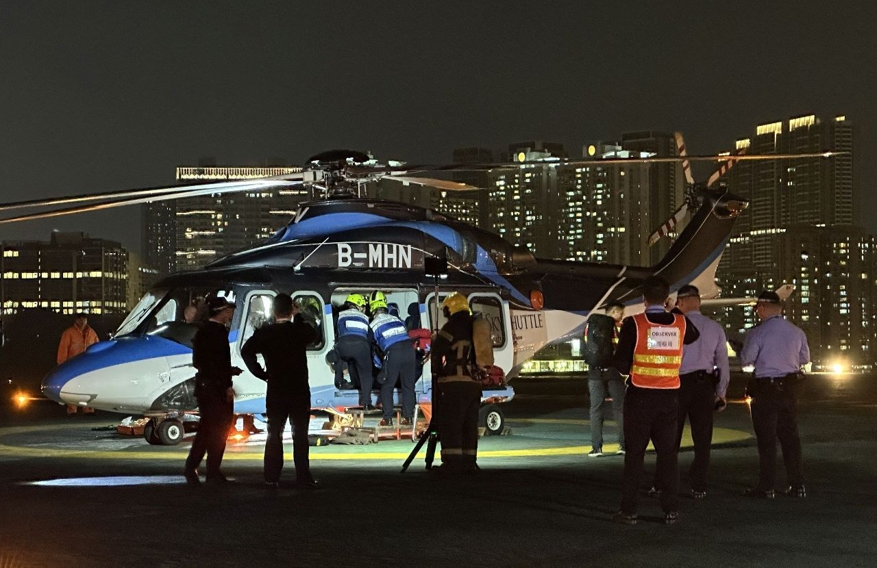 演習於昨晚8時開始,歷時約1小時,共有約100名人員參與,動用消防救援車及救護車共7輛,整體過程順暢,充分展現了跨部門協作的效率。演習由港澳直升機服務營運商亞太航空有限公司統籌策劃,參與單位包括海關、治安警察局、消防局、衛生局、海事及水務局和民航局。